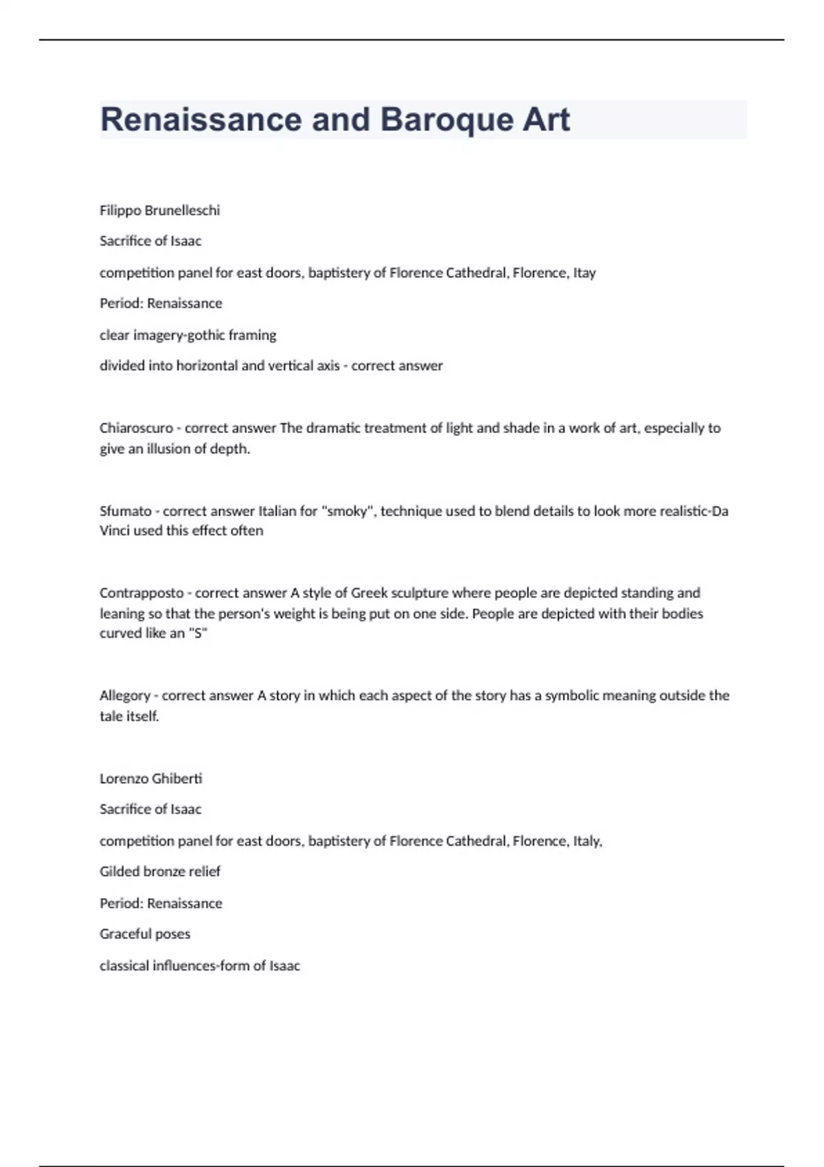 Renaissance and Baroque Art Final Exam Practice Test 2024. Filippo Brunelleschi Sacrifice of Isaac competition panel for east doors, baptistery of Florence Cathedral, Florence, Itay Period: Renaissance clear imagery-gothic framing divided into horizontal and vertical axis - correct answer Chiaroscuro - correct answer The dramatic treatment of light and shade in a work of art, especially to give an illusion of depth. Sfumato - correct answer Italian for "smoky", technique used to blend details to look more realistic-Da Vinci used this effect often Contrapposto - correct answer A style of Greek sculpture where people are depicted standing and leaning so that the person's weight is being put on one side. People are depicted with their bodies curved like an "S" Allegory - correct answer A story in which each aspect of the story has a symbolic meaning outside the tale itself. Lorenzo Ghiberti Sacrifice of Isaac competition panel for east doors, baptistery of Florence Cathedral, Florence, Italy, Gilded bronze relief Period: Renaissance Graceful poses classical influences-form of Isaac