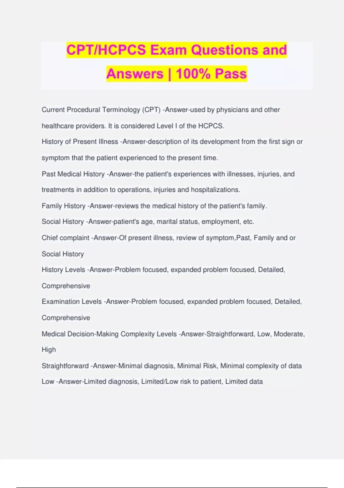 CPT/HCPCS Exam Questions and Answers | 100% Pass Current Procedural Terminology (CPT) -Answer-used by physicians and other healthcare providers. It is considered Level I of the HCPCS. History of Present Illness -Answer-description of its development from the first sign or symptom that the patient experienced to the present time. Past Medical History -Answer-the patient's experiences with illnesses, injuries, and treatments in addition to operations, injuries and hospitalizations. Family History -Answer-reviews the medical history of the patient's family. Social History -Answer-patient's age, marital status, employment, etc. Chief complaint -Answer-Of present illness, review of symptom,Past, Family and or Social History History Levels -Answer-Problem focused, expanded problem focused, Detailed, Comprehensive Examination Levels -Answer-Problem focused, expanded problem focused, Detailed, Comprehensive Medical Decision-Making Complexity Levels -Answer-Straightforward, Low, Moderate, High Straightforward -Answer-Minimal diagnosis, Minimal Risk, Minimal complexity of data Low -Answer-Limited diagnosis, Limited/Low risk to patient, Limited data Moderate -Answer-Multiple diagnoses, Moderate risk to the patient, Moderate amount of complexity of data High -Answer-Extensive diagnoses , High risk to patient, Extensive amount and comp,lexity of data Physical Status Modifiers -Answer-P1 A normal healthy patient P2 -Answer-A patient with mild systemic disease P3 -Answer-A patient with severe systemic disease P4 -Answer-A patient with severe systemic disease that is a constant threat to life P5 -Answer-A moribund patient who is not expected to survive without the operation P6 -Answer-A declared brain-dead patient whose organs are being removed for donor purposes- HCPCS Anesthesia Modifiers -Answer-AA Anesthesia services personally performed by the anesthesiologist AD -Answer-Supervision, more than four procedures QK -Answer-Medical direction of two, three, or four concurrent anesthesia procedures QS -Answer-Monitored Anesthesia Care (MAC) services (can be billed by a qualified nonphysician anesthetist or physician) QX -Answer-Qualified non-physician anesthetist with medical direction by a physician QY -Answer-Medical direction of one CRNA/AA by an anesthesiologist QZ -Answer-Certified Registered Nurse Anesthetist (CRNA) without