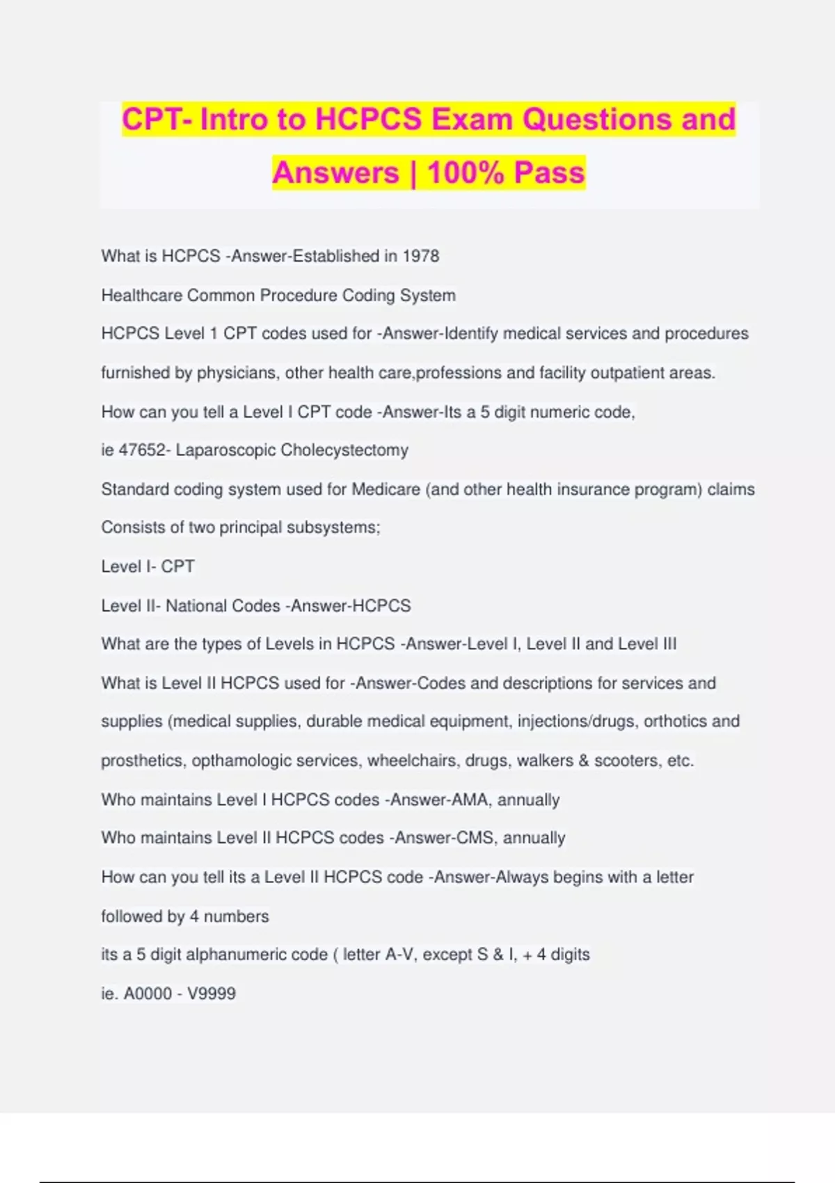CPT- Intro to HCPCS Exam Questions and Answers | 100% Pass What is HCPCS -Answer-Established in 1978 Healthcare Common Procedure Coding System HCPCS Level 1 CPT codes used for -Answer-Identify medical services and procedures furnished by physicians, other health care,professions and facility outpatient areas. How can you tell a Level I CPT code -Answer-Its a 5 digit numeric code, ie 47652- Laparoscopic Cholecystectomy Standard coding system used for Medicare (and other health insurance program) claims Consists of two principal subsystems; Level I- CPT Level II- National Codes -Answer-HCPCS What are the types of Levels in HCPCS -Answer-Level I, Level II and Level III What is Level II HCPCS used for -Answer-Codes and descriptions for services and supplies (medical supplies, durable medical equipment, injections/drugs, orthotics and prosthetics, opthamologic services, wheelchairs, drugs, walkers & scooters, etc. Who maintains Level I HCPCS codes -Answer-AMA, annually Who maintains Level II HCPCS codes -Answer-CMS, annually How can you tell its a Level II HCPCS code -Answer-Always begins with a letter followed by 4 numbers its a 5 digit alphanumeric code ( letter A-V, except S & I, + 4 digits ie. A0000 - V9999