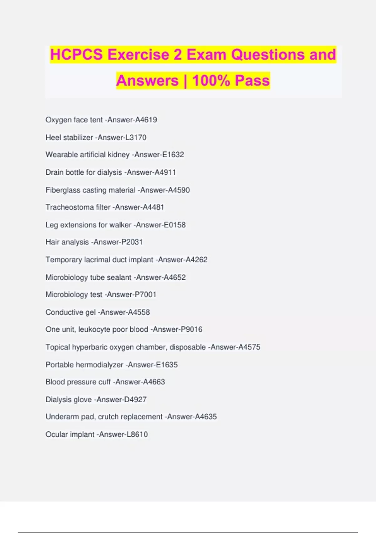 HCPCS Exercise 2 Exam Questions and Answers | 100% Pass Oxygen face tent -Answer-A4619 Heel stabilizer -Answer-L3170 Wearable artificial kidney -Answer-E1632 Drain bottle for dialysis -Answer-A4911 Fiberglass casting material -Answer-A4590 Tracheostoma filter -Answer-A4481 Leg extensions for walker -Answer-E0158 Hair analysis -Answer-P2031 Temporary lacrimal duct implant -Answer-A4262 Microbiology tube sealant -Answer-A4652 Microbiology test -Answer-P7001 Conductive gel -Answer-A4558 One unit, leukocyte poor blood -Answer-P9016
