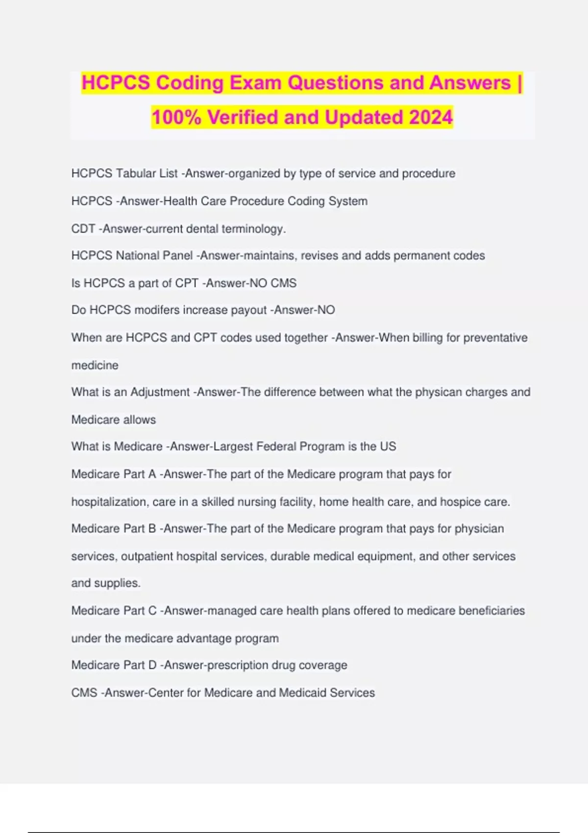 HCPCS Coding Exam Questions and Answers | 100% Verified and Updated 2024 HCPCS Tabular List -Answer-organized by type of service and procedure HCPCS -Answer-Health Care Procedure Coding System CDT -Answer-current dental terminology. HCPCS National Panel -Answer-maintains, revises and adds permanent codes Is HCPCS a part of CPT -Answer-NO CMS Do HCPCS modifers increase payout -Answer-NO When are HCPCS and CPT codes used together -Answer-When billing for preventative medicine What is an Adjustment -Answer-The difference between what the physican charges and Medicare allows What is Medicare -Answer-Largest Federal Program is the US Medicare Part A -Answer-The part of the Medicare program that pays for hospitalization, care in a skilled nursing facility, home health care, and hospice care. Medicare Part B -Answer-The part of the Medicare program that pays for physician services, outpatient hospital services, durable medical equipment, and other services and supplies. Medicare Part C -Answer-managed care health plans offered to medicare beneficiaries under the medicare advantage program Medicare Part D -Answer-prescription drug coverage