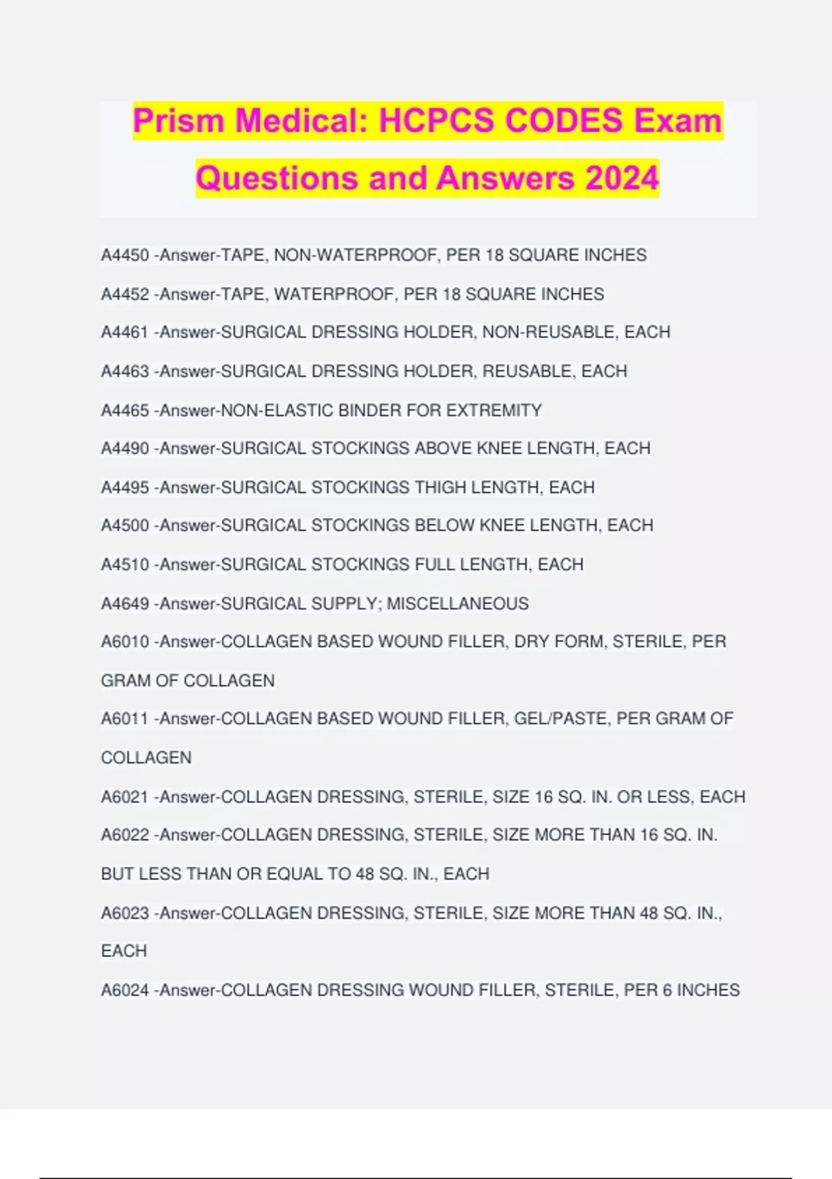 Prism Medical: HCPCS CODES Exam Questions and Answers 2024 A4450 -Answer-TAPE, NON-WATERPROOF, PER 18 SQUARE INCHES A4452 -Answer-TAPE, WATERPROOF, PER 18 SQUARE INCHES A4461 -Answer-SURGICAL DRESSING HOLDER, NON-REUSABLE, EACH A4463 -Answer-SURGICAL DRESSING HOLDER, REUSABLE, EACH A4465 -Answer-NON-ELASTIC BINDER FOR EXTREMITY A4490 -Answer-SURGICAL STOCKINGS ABOVE KNEE LENGTH, EACH A4495 -Answer-SURGICAL STOCKINGS THIGH LENGTH, EACH A4500 -Answer-SURGICAL STOCKINGS BELOW KNEE LENGTH, EACH A4510 -Answer-SURGICAL STOCKINGS FULL LENGTH, EACH A4649 -Answer-SURGICAL SUPPLY; MISCELLANEOUS A6010 -Answer-COLLAGEN BASED WOUND FILLER, DRY FORM, STERILE, PER GRAM OF COLLAGEN A6011 -Answer-COLLAGEN BASED WOUND FILLER, GEL/PASTE, PER GRAM OF COLLAGEN A6021 -Answer-COLLAGEN DRESSING, STERILE, SIZE 16 SQ. IN. OR LESS, EACH A6022 -Answer-COLLAGEN DRESSING, STERILE, SIZE MORE THAN 16 SQ. IN. BUT LESS THAN OR EQUAL TO 48 SQ. IN., EACH A6023 -Answer-COLLAGEN DRESSING, STERILE, SIZE MORE THAN 48 SQ. IN., EACH A6024 -Answer-COLLAGEN DRESSING WOUND FILLER, STERILE, PER 6 INCHES A6025 -Answer-GEL SHEET FOR DERMAL OR EPIDERMAL APPLICATION, (E.G., SILICONE, HYDROGEL, OTHER), EACH A6154 -Answer-WOUND POUCH, EACH A6196 -Answer-ALGINATE OR OTHER FIBER GELLING DRESSING, WOUND COVER, STERILE, PAD SIZE 16 SQ. IN. OR LESS, EACH DRESSING A6197 -Answer-ALGINATE OR OTHER FIBER GELLING DRESSING, WOUND COVER, STERILE, PAD SIZE MORE THAN 16 SQ. IN. BUT LESS THAN OR EQUAL TO 48 SQ. IN., EACH DRESSING A6198 -Answer-ALGINATE OR OTHER FIBER GELLING DRESSING, WOUND COVER, STERILE, PAD SIZE MORE THAN 48 SQ. IN., EACH DRESSING A6199 -Answer-ALGINATE OR OTHER FIBER GELLING DRESSING, WOUND FILLER, STERILE, PER 6 INCHES A6203 -Answer-COMPOSITE DRESSING, STERILE, PAD SIZE 16 SQ. IN. OR LESS, WITH ANY SIZE ADHESIVE BORDER, EACH DRESSING A6204 -Answer-COMPOSITE DRESSING, STERILE, PAD SIZE MORE THAN 16 SQ. IN. BUT LESS THAN OR EQUAL TO 48 SQ. IN., WITH ANY SIZE ADHESIVE BORDER, EACH DRESSING A6205 -Answer-COMPOSITE DRESSING, STERILE, PAD SIZE MORE THAN 48 SQ. IN., WITH ANY SIZE ADHESIVE BORDER, EACH DRESSING A6206 -Answer-CONTACT LAYER, STERILE, 16 SQ. IN. OR LESS, EACH DRESSING A6207 -Answer-CONTACT LAYER, STERILE, MORE THAN 16 SQ. IN. BUT LESS THAN OR EQUAL TO 48 SQ. IN., EACH DRESSING A6208 -Answer-CONTACT LAYER, STERILE, MORE THAN 48 SQ. IN., EACH DRESSING A6209 -Answer-FOAM DRESSING, WOUND COVER, STERILE, PAD SIZE 16 SQ. IN. OR LESS, WITHOUT ADHESIVE BORDER, EACH DRESSING A6210 -Answer-FOAM DRESSING, WOUND COVER, STERILE, PAD SIZE MORE THAN 16 SQ. IN. BUT LESS THAN OR EQUAL TO 48 SQ. IN., WITHOUT ADHESIVE BORDER, EACH DRESSING A6211 -Answer-FOAM DRESSING, WOUND COVER, STERILE, PAD SIZE MORE THAN 48 SQ. IN., WITHOUT ADHESIVE BORDER, EACH DRESSING A6212 -Answer-FOAM DRESSING, WOUND COVER, STERILE, PAD SIZE 16 SQ. IN. OR LESS, WITH ANY SIZE ADHESIVE BORDER, EACH DRESSING A6213 -Answer-FOAM DRESSING, WOUND COVER, STERILE, PAD SIZE MORE THAN 16 SQ. IN. BUT LESS THAN OR EQUAL TO 48 SQ. IN., WITH ANY SIZE ADHESIVE BORDER, EACH DRESSING A6214 -Answer-FOAM DRESSING, WOUND COVER, STERILE, PAD SIZE MORE THAN 48 SQ. IN., WITH ANY SIZE ADHESIVE BORDER, EACH DRESSING A6215 -Answer-FOAM DRESSING, WOUND FILLER, STERILE, PER GRAM A6216 -Answer-GAUZE, NON-IMPREGNATED, NON-STERILE, PAD SIZE 16 SQ. IN. OR LESS, WITHOUT ADHESIVE BORDER, EACH DRESSING A6217 -Answer-LESS THAN OR EQUAL TO 48 SQ. IN., WITHOUT ADHESIVE BORDER, EACH DRESSING A6218 -Answer-GAUZE, NON-IMPREGNATED, NON-STERILE, PAD SIZE MORE THAN 48 SQ. IN., WITHOUT ADHESIVE BORDER, EACH DRESSING A6219 -Answer-GAUZE, NON-IMPREGNATED, STERILE, PAD SIZE 16 SQ. IN. OR LESS, WITH ANY SIZE ADHESIVE BORDER, EACH DRESSING A6220 -Answer-GAUZE, NON-IMPREGNATED, STERILE, PAD SIZE MORE THAN 16 SQ. IN. BUT LESS THAN OR EQUAL TO 48 SQ. IN., WITH ANY SIZE ADHESIVE BORDER, EACH DRESSING A6221 -Answer-GAUZE, NON-IMPREGNATED, STERILE, PAD SIZE MORE THAN 48 SQ. IN., WITH ANY SIZE ADHESIVE BORDER, EA