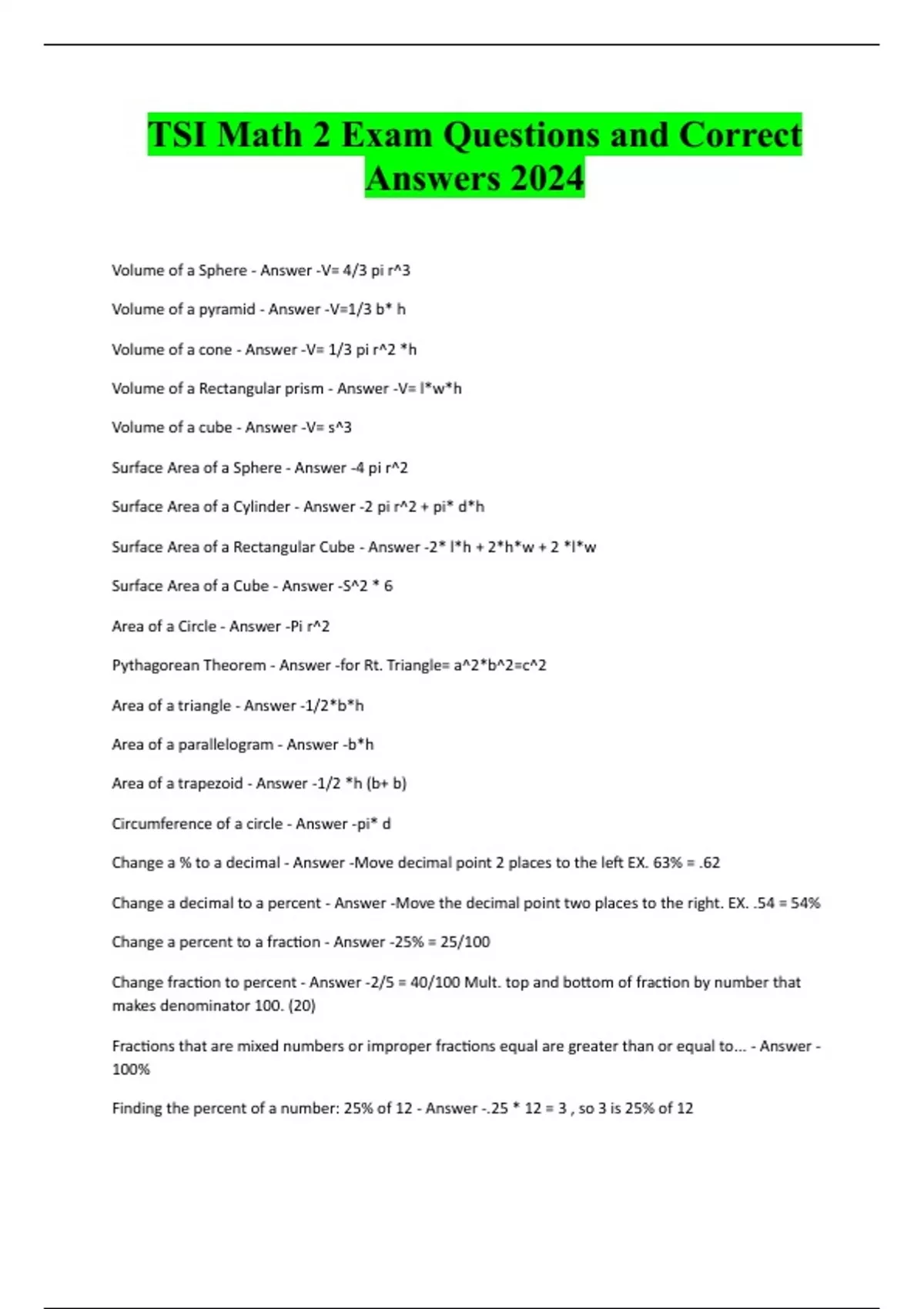 TSI Math 2 Exam Questions and Correct Answers 2024 Volume of a Sphere - Answer -V= 4/3 pi r^3 Volume of a pyramid - Answer -V=1/3 b* h Volume of a cone - Answer -V= 1/3 pi r^2 *h Volume of a Rectangular prism - Answer -V= l*w*h Volume of a cube - Answer -V= s^3 Surface Area of a Sphere - Answer -4 pi r^2 Surface Area of a Cylinder - Answer -2 pi r^2 + pi* d*h Surface Area of a Rectangular Cube - Answer -2* l*h + 2*h*w + 2 *l*w Surface Area of a Cube - Answer -S^2 * 6 Area of a Circle - Answer -Pi r^2