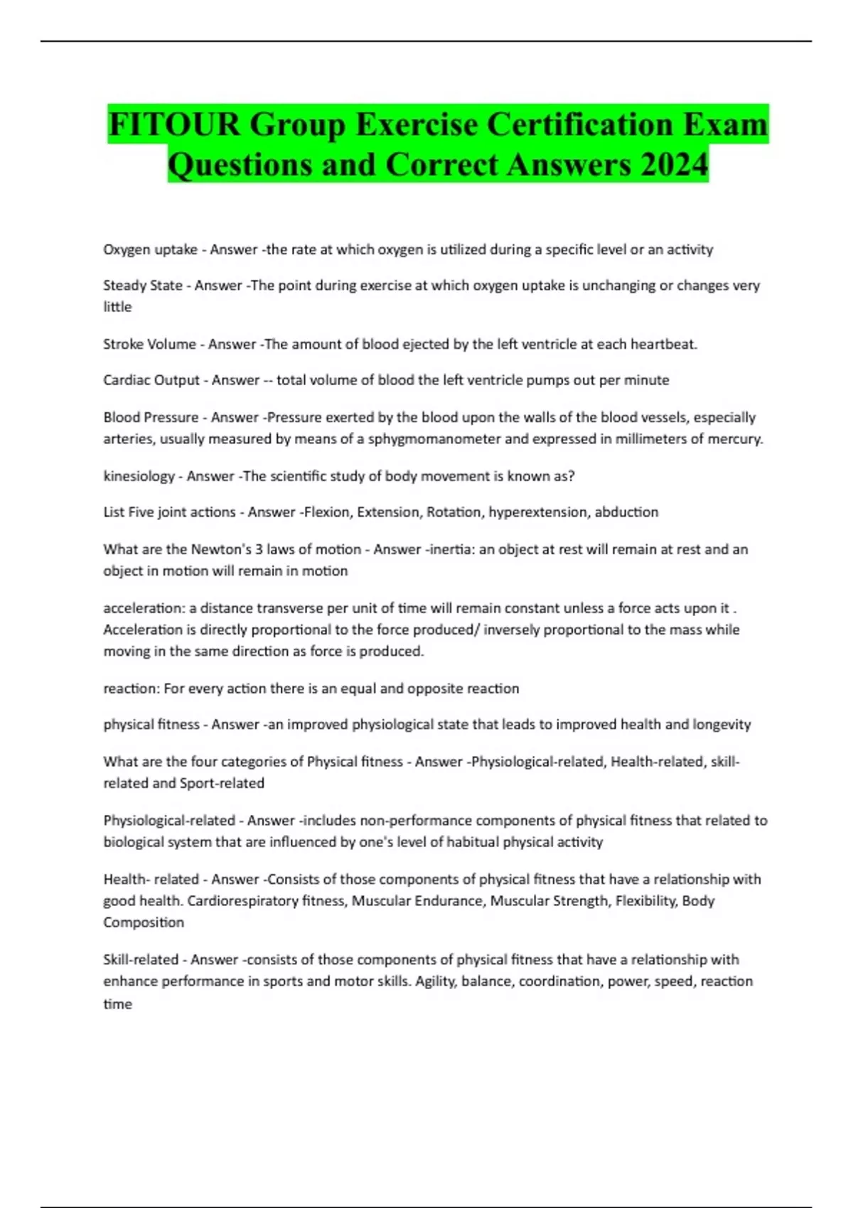 FITOUR Group Exercise Certification Exam Questions and Correct Answers 2024 Oxygen uptake - Answer -the rate at which oxygen is utilized during a specific level or an activity Steady State - Answer -The point during exercise at which oxygen uptake is unchanging or changes very little Stroke Volume - Answer -The amount of blood ejected by the left ventricle at each heartbeat. Cardiac Output - Answer -- total volume of blood the left ventricle pumps out per minute Blood Pressure - Answer -Pressure exerted by the blood upon the walls of the blood vessels, especially arteries, usually measured by means of a sphygmomanometer and expressed in millimeters of mercury. kinesiology - Answer -The scientific study of body movement is known as? List Five joint actions - Answer -Flexion, Extension, Rotation, hyperextension, abduction What are the Newton's 3 laws of motion - Answer -inertia: an object at rest will remain at rest and an object in motion will remain in motion acceleration: a distance transverse per unit of time will remain constant unless a force acts upon it . Acceleration is directly proportional to the force produced/ inversely proportional to the mass while moving in the same direction as force is produced. reaction: For every action there is an equal and opposite reaction physical fitness - Answer -an improved physiological state that leads to improved health and longevity What are the four categories of Physical fitness - Answer -Physiological-related, Health-related, skillrelated and Sport-related Physiological-related - Answer -includes non-pe