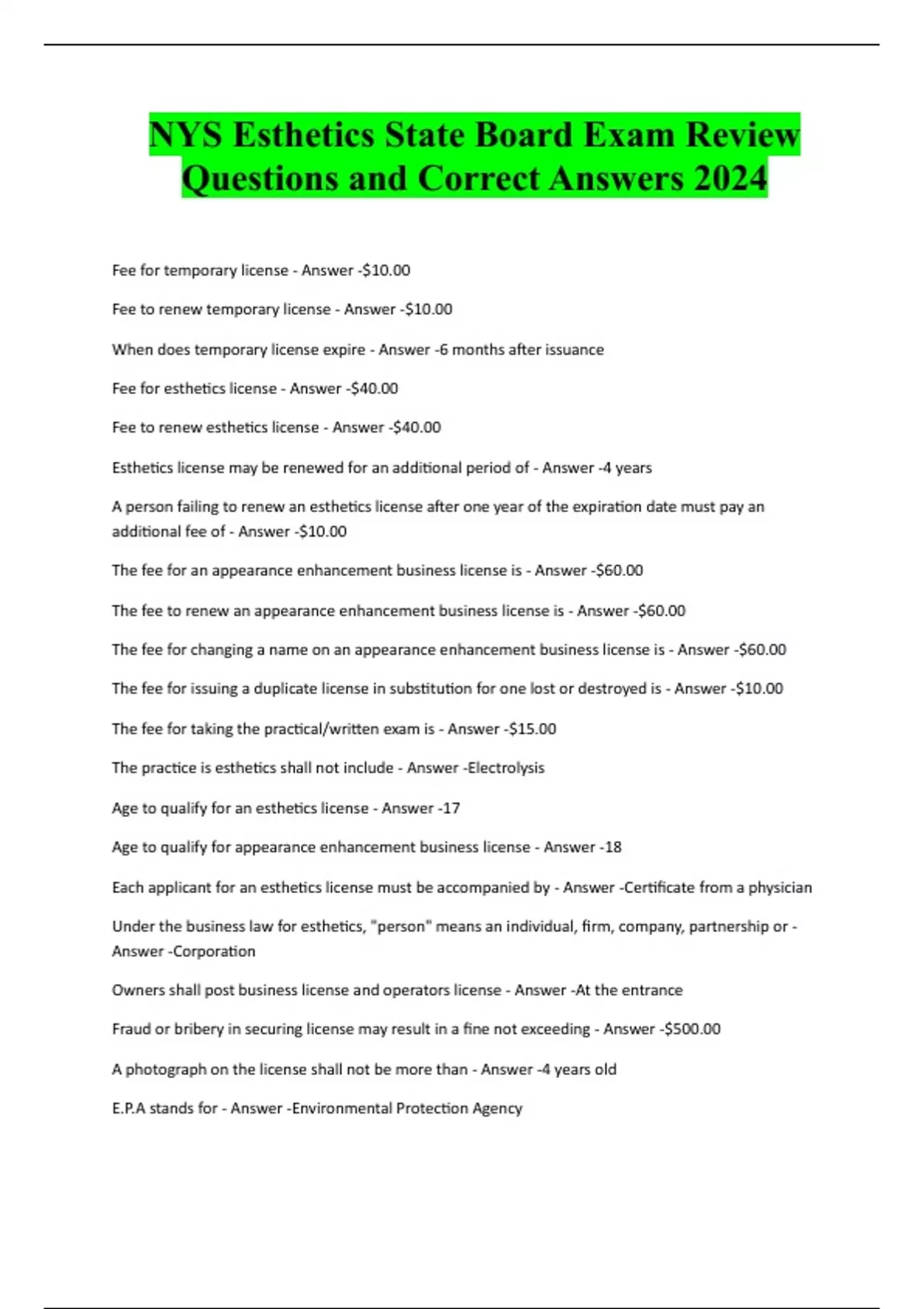NYS Esthetics State Board Exam Review Questions and Correct Answers 2024 Fee for temporary license - Answer -$10.00 Fee to renew temporary license - Answer -$10.00 When does temporary license expire - Answer -6 months after issuance Fee for esthetics license - Answer -$40.00 Fee to renew esthetics license - Answer -$40.00 Esthetics license may be renewed for an additional period of - Answer -4 years A person failing to renew an esthetics license after one year of the expiration date must pay an additional fee of - Answer -$10.00 The fee for an appearance enhancement business license is - Answer -$60.00 The fee to renew an appearance enhancement business license is - Answer -$60.00 The fee for changing a name on an appearance enhanceme