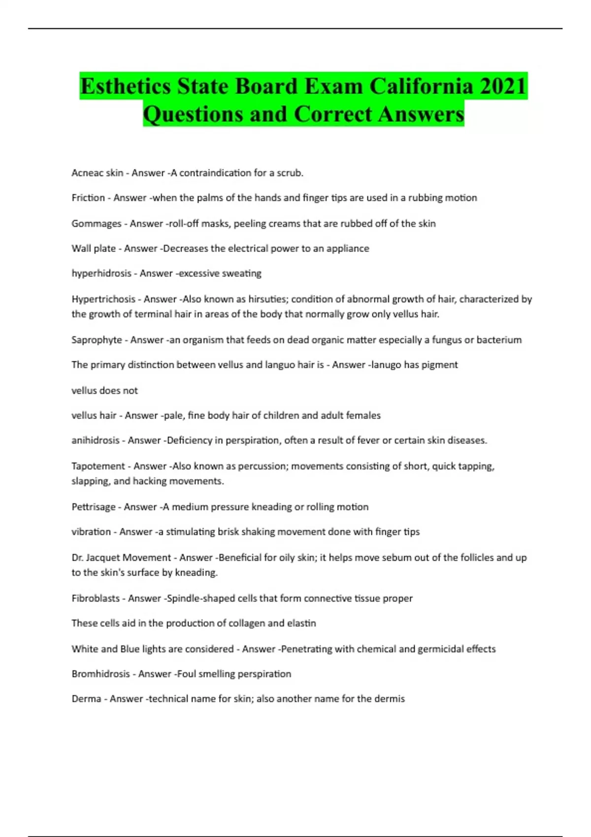 Esthetics State Board Exam California 2021 Questions and Correct Answers Acneac skin - Answer -A contraindication for a scrub. Friction - Answer -when the palms of the hands and finger tips are used in a rubbing motion Gommages - Answer -roll-off masks, peeling creams that are rubbed off of the skin Wall plate - Answer -Decreases the electrical power to an appliance hyperhidrosis - Answer -excessive sweating Hypertrichosis - Answer -Also known as hirsuties; condition of abnormal growth of hair, characterized by the growth of terminal hair in areas of the body that normally grow only vellus hair. Saprophyte - Answer -an organism that feeds on dead organic matter especially a fungus or bacterium The primary distinction between vellus and languo hair is - Answer -lanugo has pigment vellus does not vellus hair - Answer -pale, fine body hair of children and adult females anihidrosis - Answer -Deficiency in perspiration, often a result of fever or certain skin diseases. Tapotement - Answer -Also known as percussion; movements consisting of short, quick tapping, slapping, and hacking movements. Pettrisage - Answer -A medium pressure kneading or rolling motion vibration - Answer -a stimulating brisk shaking movement done with finger tips Dr. Jacquet Movement - Answer -Beneficial for oily skin; it helps move sebum out of the follicles and up to the skin's surface by kneading. Fibroblasts - Answer -Spindle-shaped cells that form connective tissue proper These cells aid in the production of collagen and elastin White and Blue lights are considered - Answer -Penetrating with chemical and germicidal effects Bromhidrosis - Answer -Foul smelling perspiration Derma - Answer -technical name for skin; also another name for the derm