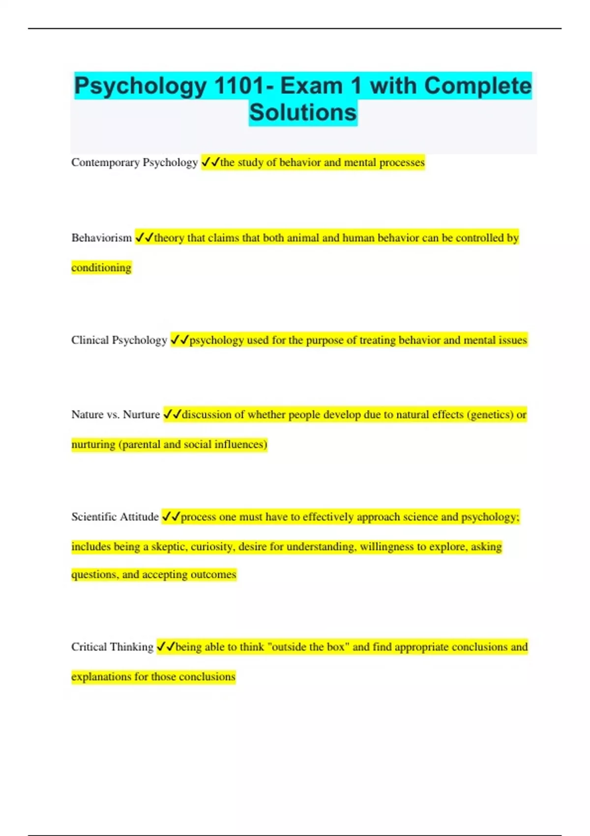 Psychology 1101- Exam 1 with Complete Solutions Contemporary Psychology the study of behavior and mental processes Behaviorism theory that claims that both animal and human behavior can be controlled by conditioning Clinical Psychology psychology used for the purpose of treating behavior and mental issues Nature vs. Nurture discussion of whether people develop due to natural effects (genetics) or nurturing (parental and social influences) Scientific Attitude process one must have to effectively approach science and psychology; includes being a skeptic, curiosity, desire for understanding, willingness to explore, asking questions, and accepting outcomes Critical Thinking being able to think "outside the box" and find appropriate conclusions and explanations for those conclusions Hindsight Bias people will have a tendency to claim that they "expected the outcome" after it happened Overconfidence people will have a tendency to overestimate their accuracy based on previous assumptions Intuition the ability to understand a concept immediately or very quickly Theory explanation of observations Hypothesis a testable prediction Operational Definition stating procedures and defining variables and terms Variables action (IV) and reaction (DV) Replication repeating the essence of a study Case Study looking at a single case to gain additional understanding of it's circumstances; intent is to generalize to other related cases Naturalistic Observation observing a person or animal in their regular day to day life (habitat); usually focused on one or more behaviors for monitoring Survey asking people to report opinions, attitudes, or behaviors; wording can be biased; sampling must be used Experiment experimental method is used to determine the relationship between the independent and dependent variables; use a control and experimental group Sample Size larger samples give a better representation of the whole population Random Selection selecting random people to respond as part of the sample Representative Selection choosing a selection of the population that most closely represents the overall population in terms of demographics