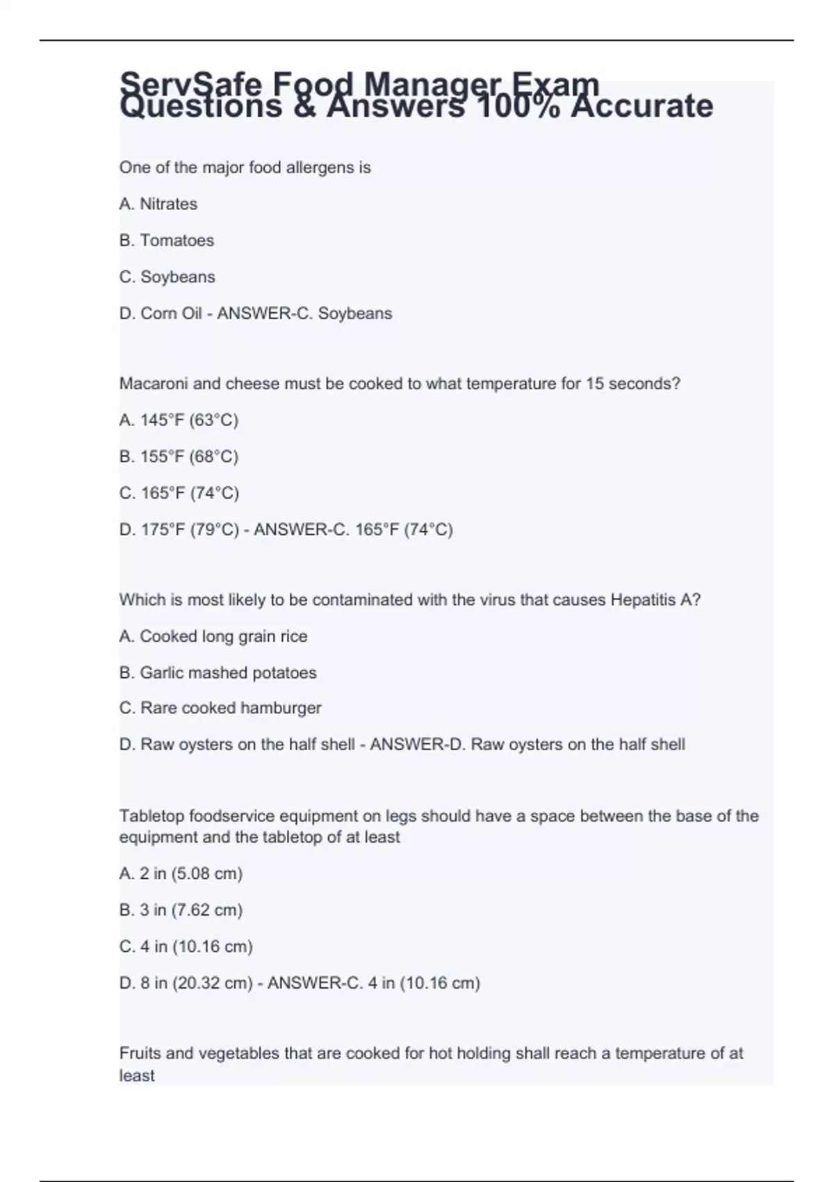 One of the major food allergens is A. Nitrates B. Tomatoes C. Soybeans D. Corn Oil - ANSWER-C. Soybeans Macaroni and cheese must be cooked to what temperature for 15 seconds? A. 145°F (63°C) B. 155°F (68°C) C. 165°F (74°C) D. 175°F (79°C) - ANSWER-C. 165°F (74°C) Which is most likely to be contaminated with the virus that causes Hepatitis A? A. Cooked long grain rice B. Garlic mashed potatoes C. Rare cooked hamburger D. Raw oysters on the half shell - ANSWER-D. Raw oysters on the half shell Tabletop foodservice equipment on legs should have a space between the base of the equipment and the tabletop of at least A. 2 in (5.08 cm) B. 3 in (7.62 cm) C. 4 in (10.16 cm) D. 8 in (20.32 cm) - ANSWER-C. 4 in (10.16 cm)