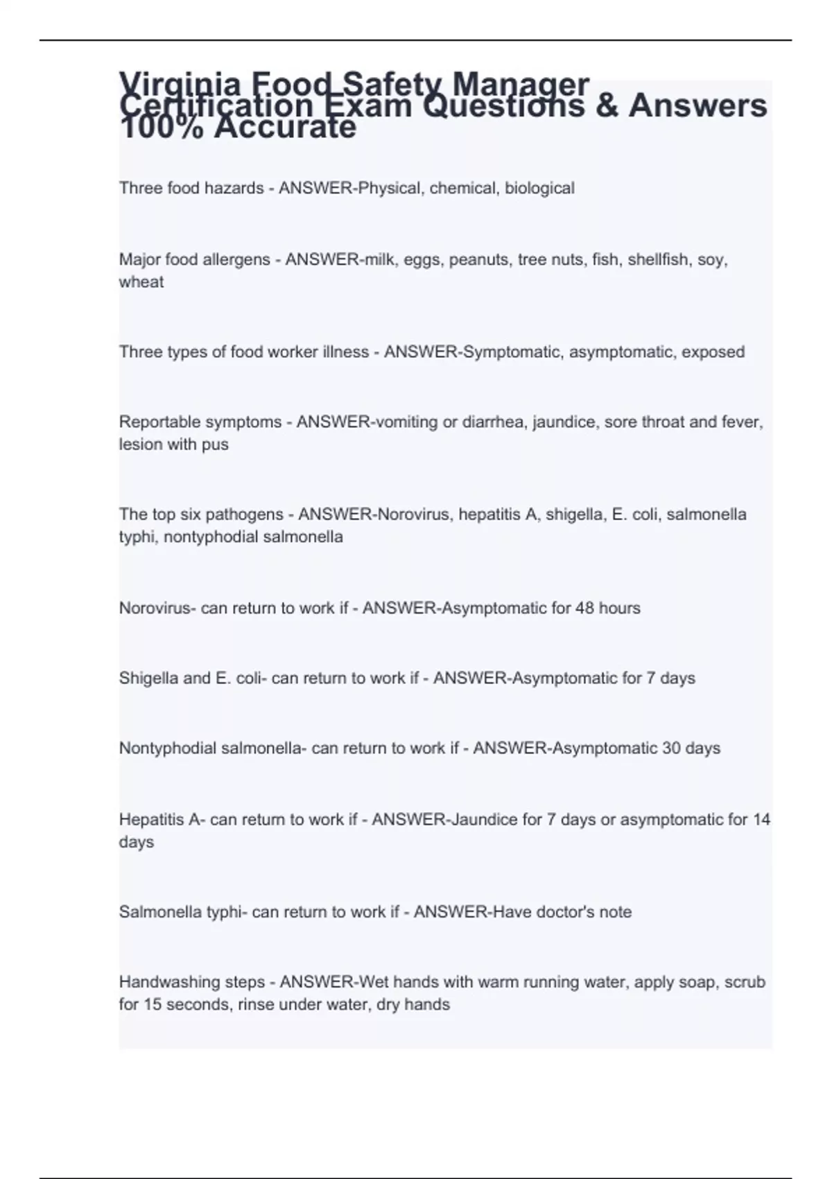 Three food hazards - ANSWER-Physical, chemical, biological Major food allergens - ANSWER-milk, eggs, peanuts, tree nuts, fish, shellfish, soy, wheat Three types of food worker illness - ANSWER-Symptomatic, asymptomatic, exposed Reportable symptoms - ANSWER-vomiting or diarrhea, jaundice, sore throat and fever, lesion with pus The top six pathogens - ANSWER-Norovirus, hepatitis A, shigella, E. coli, salmonella typhi, nontyphodial salmonella Norovirus- can return to work if - ANSWER-Asymptomatic for 48 hours Shigella and E. coli- can return to work if - ANSWER-Asymptomatic for 7 days Nontyphodial salmonella- can return to work if - ANSWER-Asymptomatic 30 days Hepatitis A- can return to work if - ANSWER-Jaundice for 7 days or asymptomatic for 14 days Salmonella typhi- can return to work if - ANSWER-Have doctor's note