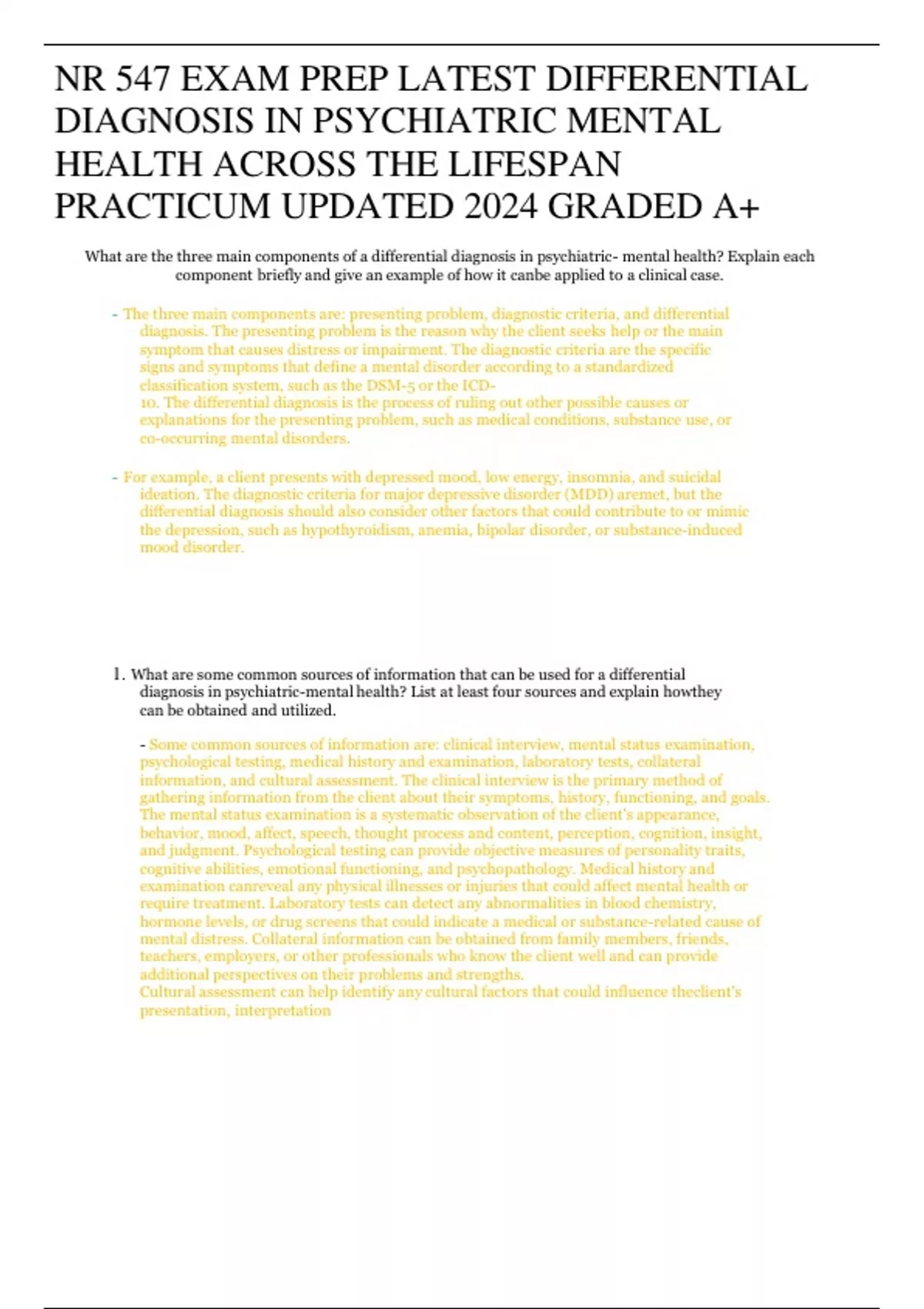 NR 547 EXAM PREP LATEST DIFFERENTIAL DIAGNOSIS IN PSYCHIATRIC MENTAL HEALTH ACROSS THE LIFESPAN PRACTICUM UPDATED 2024 GRADED A+ NR 547 EXAM PREP LATEST DIFFERENTIAL DIAGNOSIS IN PSYCHIATRIC MENTAL HEALTH ACROSS THE LIFESPAN PRACTICUM UPDATED 2024 GRADED A+