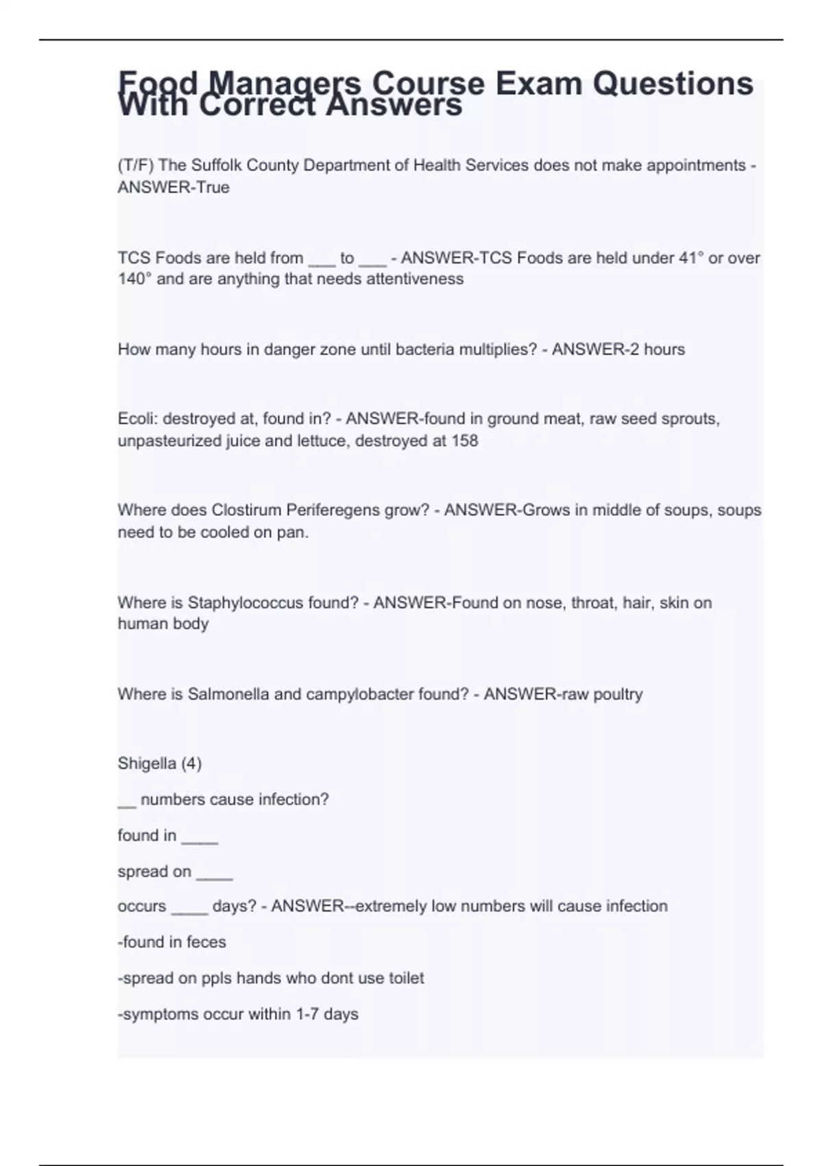 (T/F) The Suffolk County Department of Health Services does not make appointments - ANSWER-True TCS Foods are held from ___ to ___ - ANSWER-TCS Foods are held under 41° or over 140° and are anything that needs attentiveness How many hours in danger zone until bacteria multiplies? - ANSWER-2 hours Ecoli: destroyed at, found in? - ANSWER-found in ground meat, raw seed sprouts, unpasteurized juice and lettuce, destroyed at 158 Where does Clostirum Periferegens grow? - ANSWER-Grows in middle of soups, soups need to be cooled on pan. Where is Staphylococcus found? - ANSWER-Found on nose, throat, hair, skin on human body Where is Salmonella and campylobacter found? - ANSWER-raw poultry Shigella (4) __ numbers cause infection? found in ____ spread on ____ occurs ____ days? - ANSWER--extremely low numbers will cause infection -found in feces -spread on ppls hands who dont use toilet -symptoms occur within 1-7 days