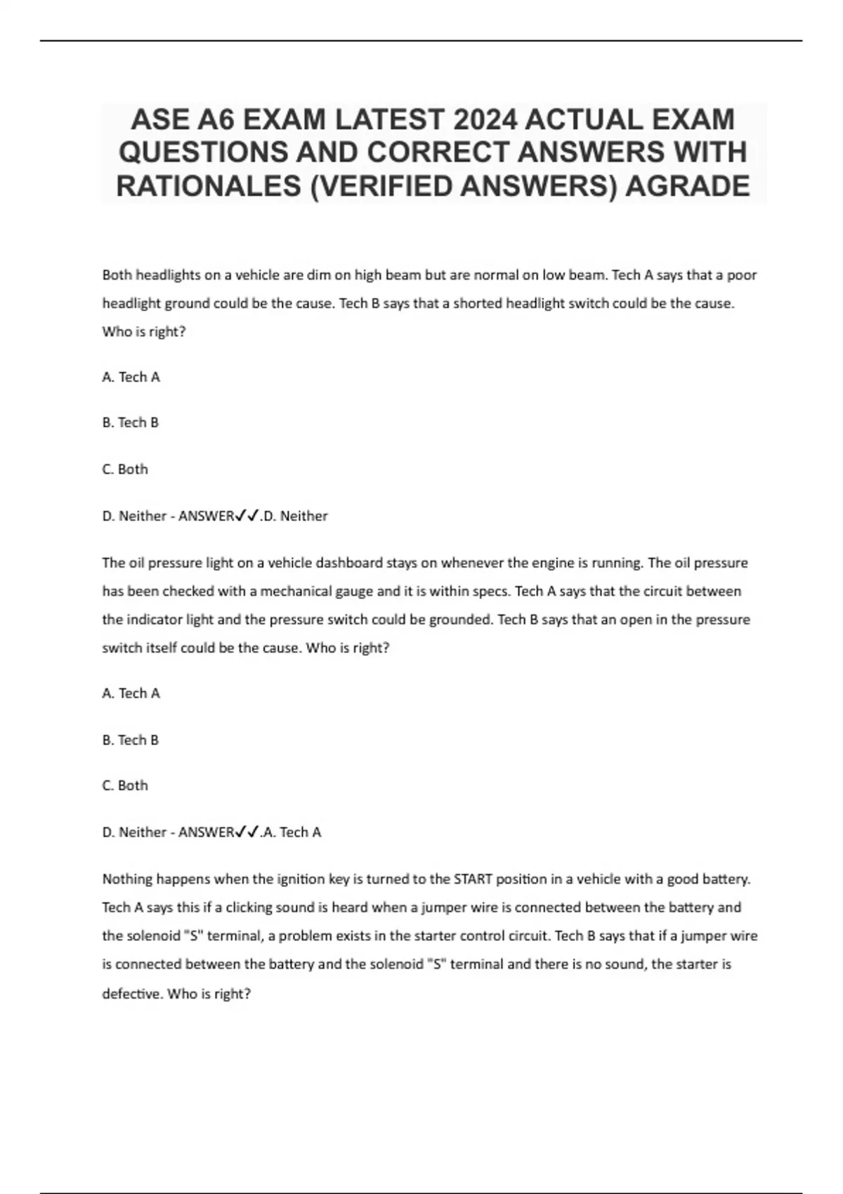 ASE A6 EXAM LATEST 2024 ACTUAL EXAM QUESTIONS AND CORRECT ANSWERS WITH RATIONALES (VERIFIED ANSWERS) AGRADE