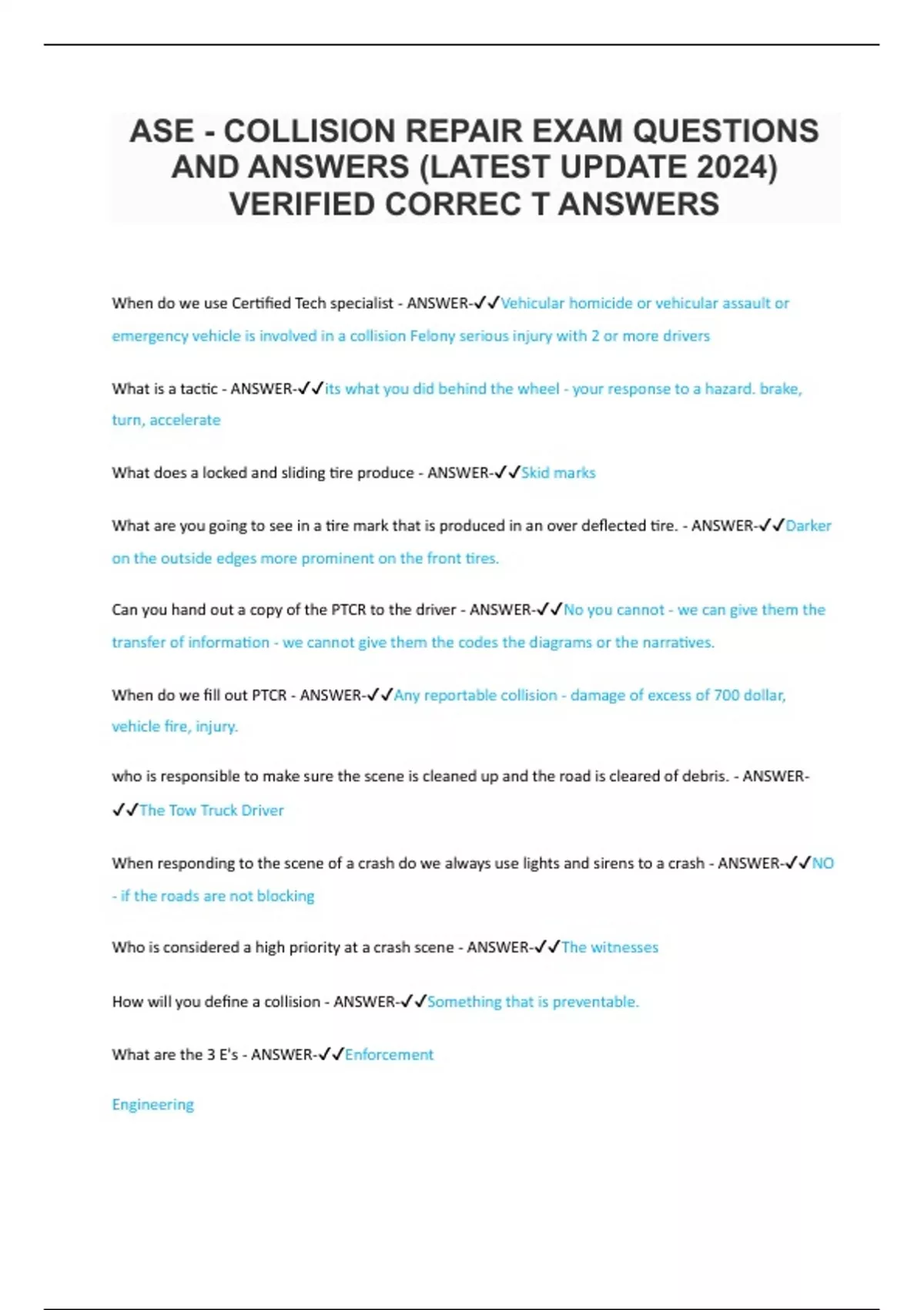 ASE - COLLISION REPAIR EXAM QUESTIONS AND ANSWERS (LATEST UPDATE 2024) VERIFIED CORREC T ANSWERS