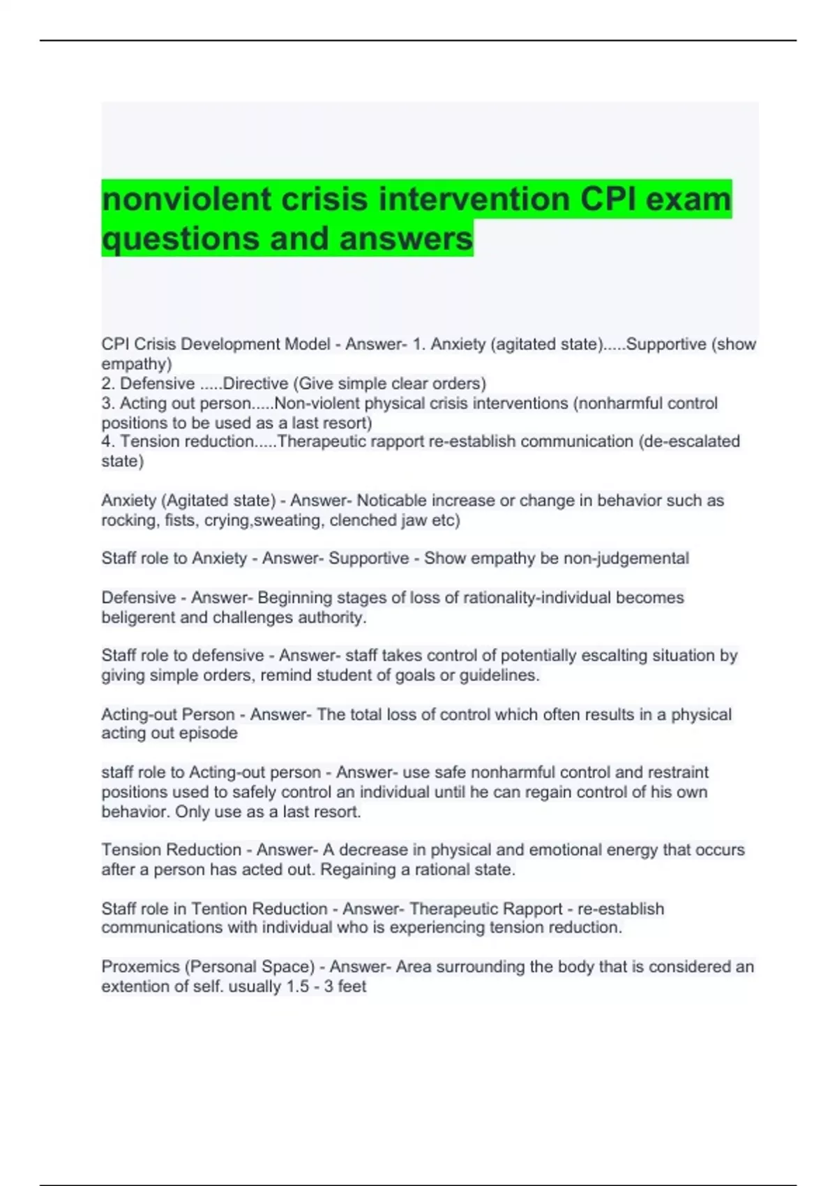 nonviolent crisis intervention CPI exam questions and answers 2024