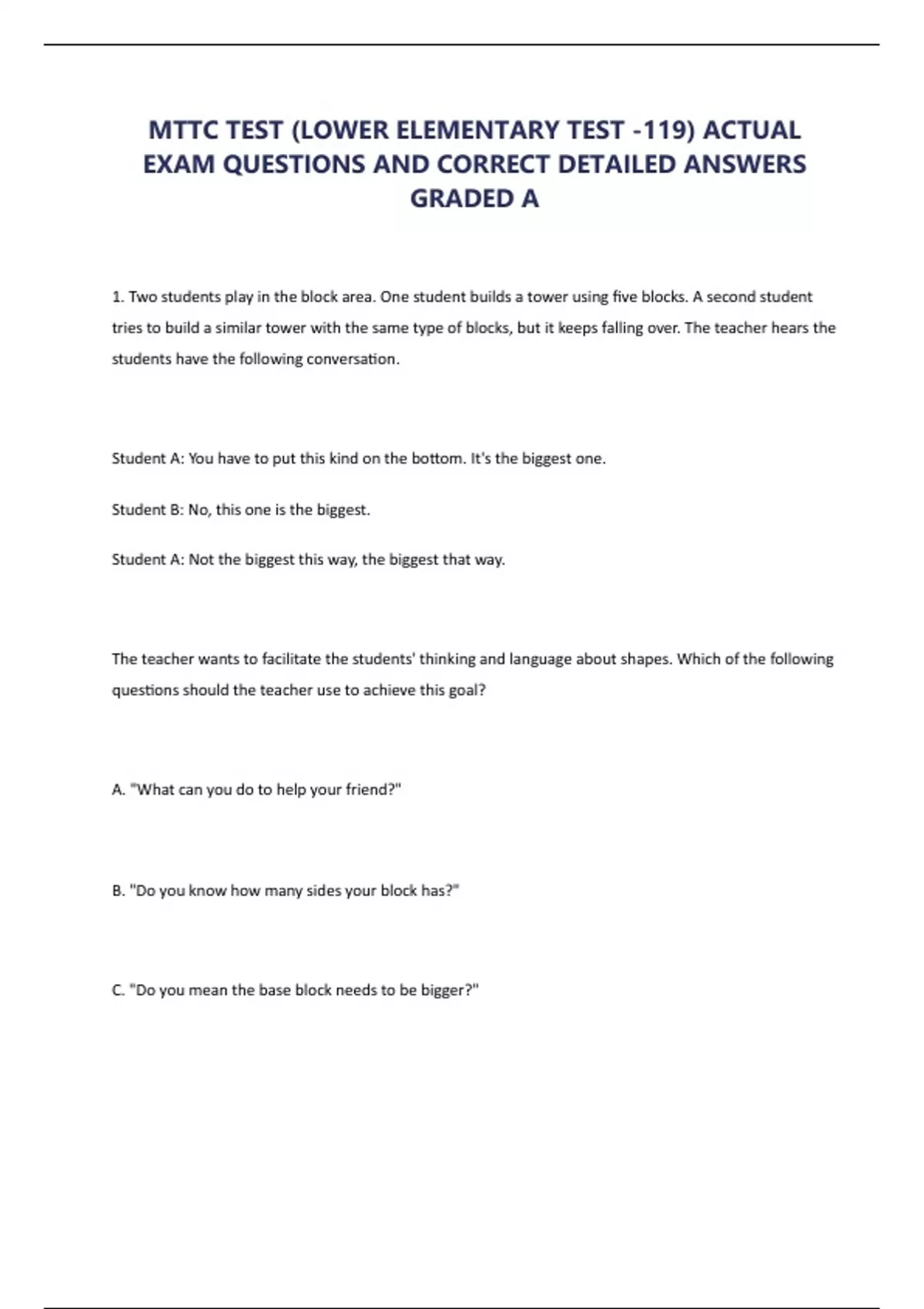 MTTC TEST (LOWER ELEMENTARY TEST -119) ACTUAL EXAM QUESTIONS AND CORRECT DETAILED ANSWERS GRADED A.