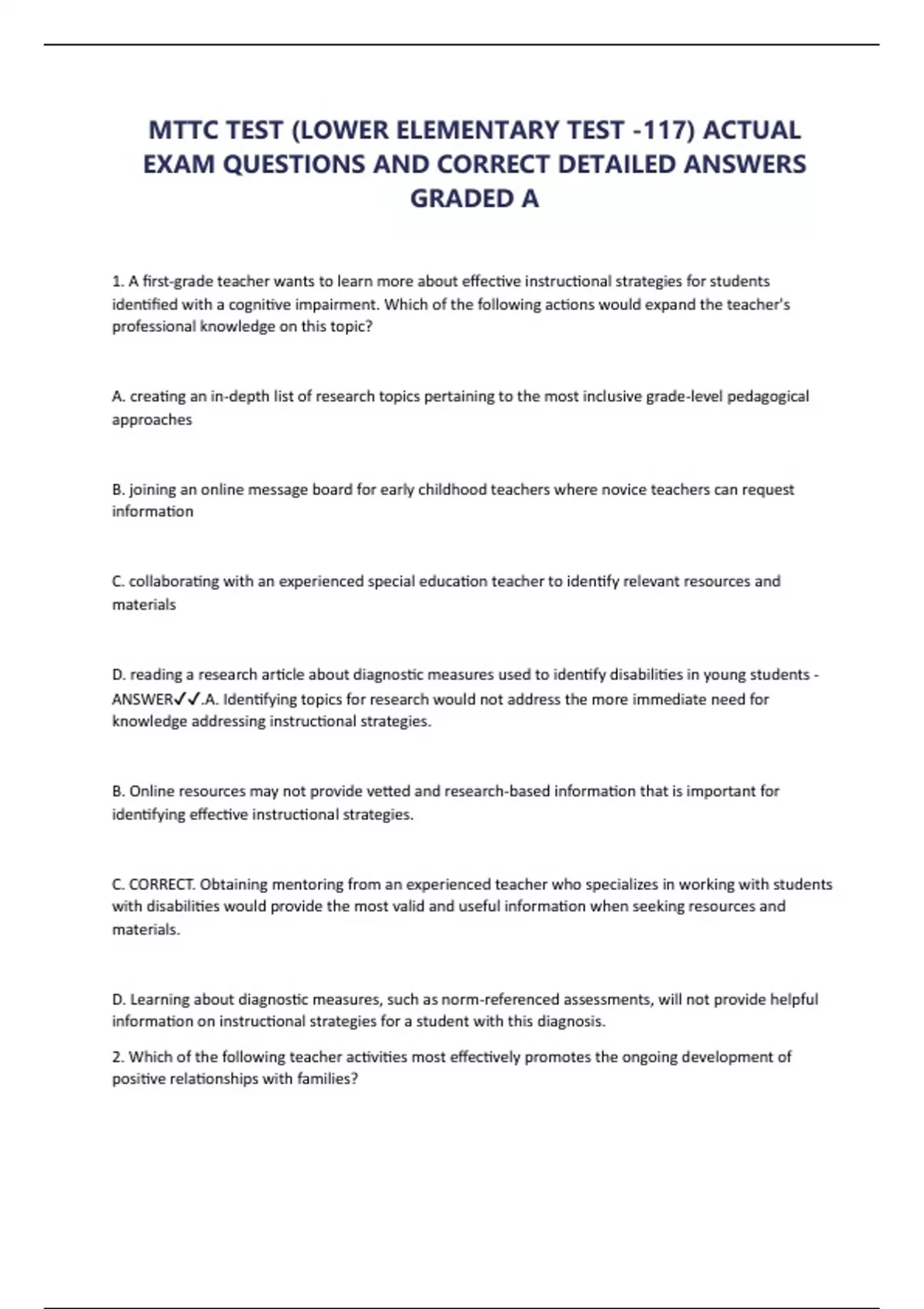 MTTC TEST (LOWER ELEMENTARY TEST -117) ACTUAL EXAM QUESTIONS AND CORRECT DETAILED ANSWERS GRADED A.