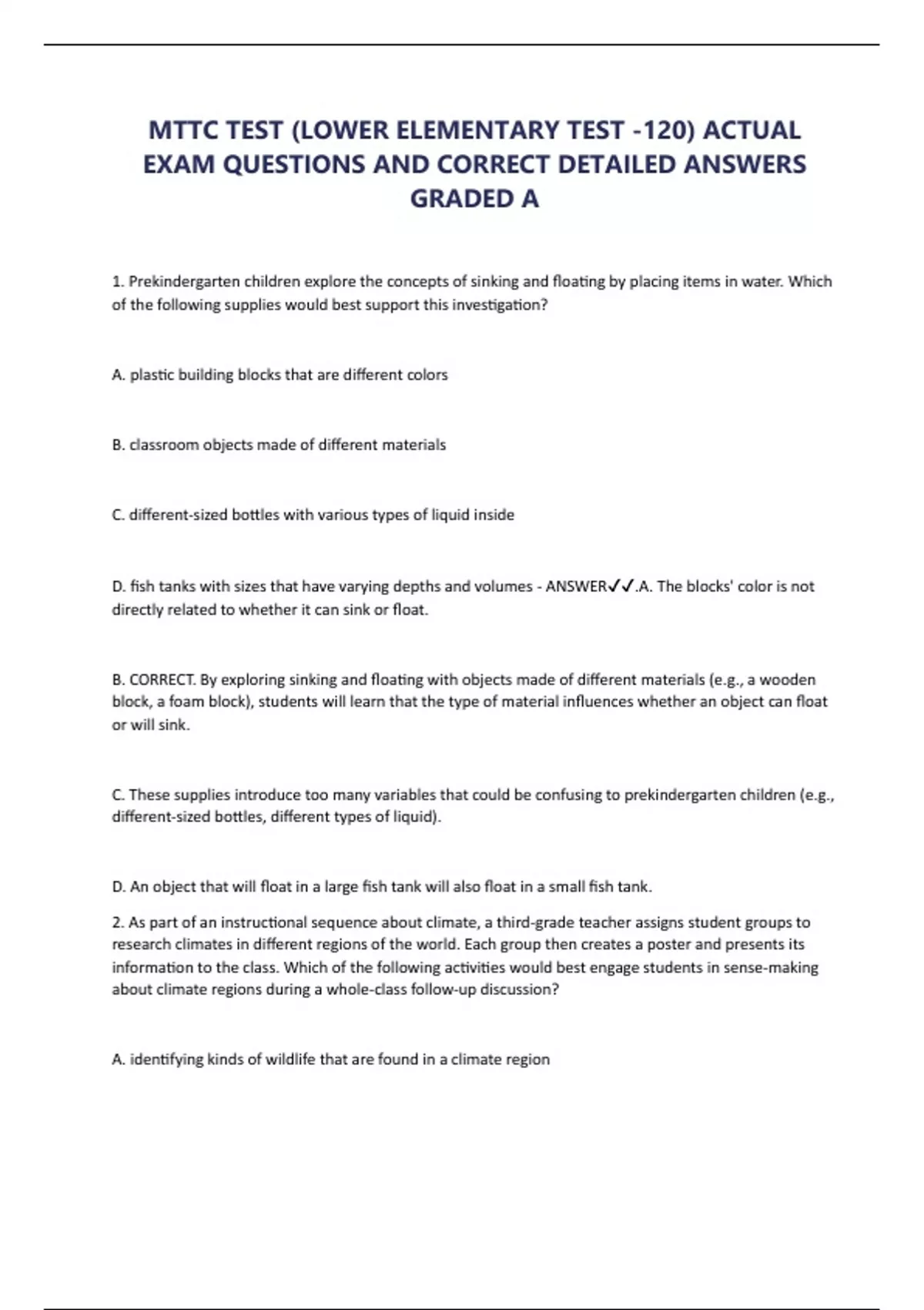 MTTC TEST (LOWER ELEMENTARY TEST -120) ACTUAL EXAM QUESTIONS AND CORRECT DETAILED ANSWERS GRADED A