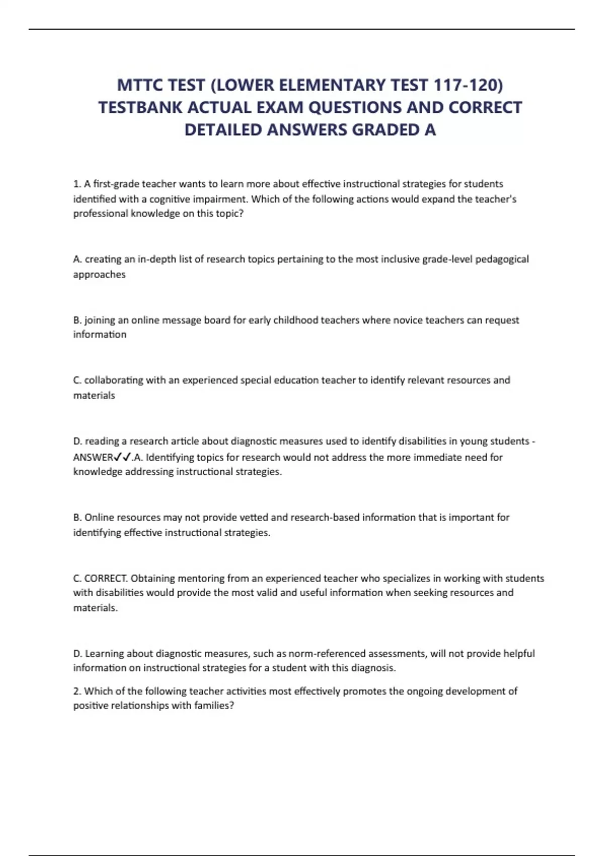 MTTC TEST (LOWER ELEMENTARY TEST 117-120) TESTBANK ACTUAL EXAM QUESTIONS AND CORRECT DETAILED ANSWERS GRADED A.