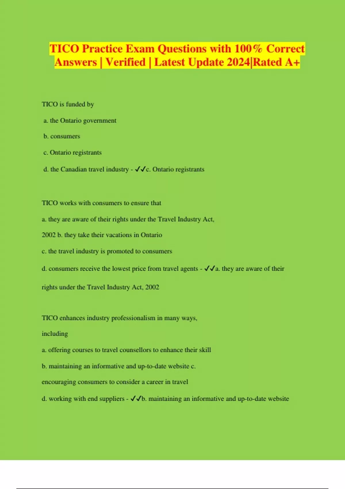 TICO is funded by a. the Ontario government b. consumers c. Ontario registrants d. the Canadian travel industry - c. Ontario registrants TICO works with consumers to ensure that a. they are aware of their rights under the Travel Industry Act, 2002 b. they take their vacations in Ontario c. the travel industry is promoted to consumers d. consumers receive the lowest price from travel agents - a. they are aware of their rights under the Travel Industry Act, 2002 TICO enhances industry professionalism in many ways, including a. offering courses to travel counsellors to enhance their skill b. maintaining an informative and up-to-date website c. encouraging consumers to consider a career in travel d. working with end suppliers - b. maintaining an informative and up-to-date website