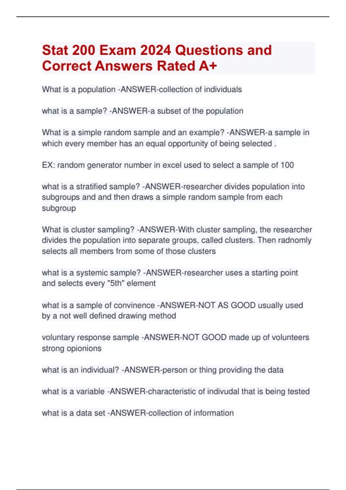 Stat 200 Exam 2024 Questions and Correct Answers Rated A+