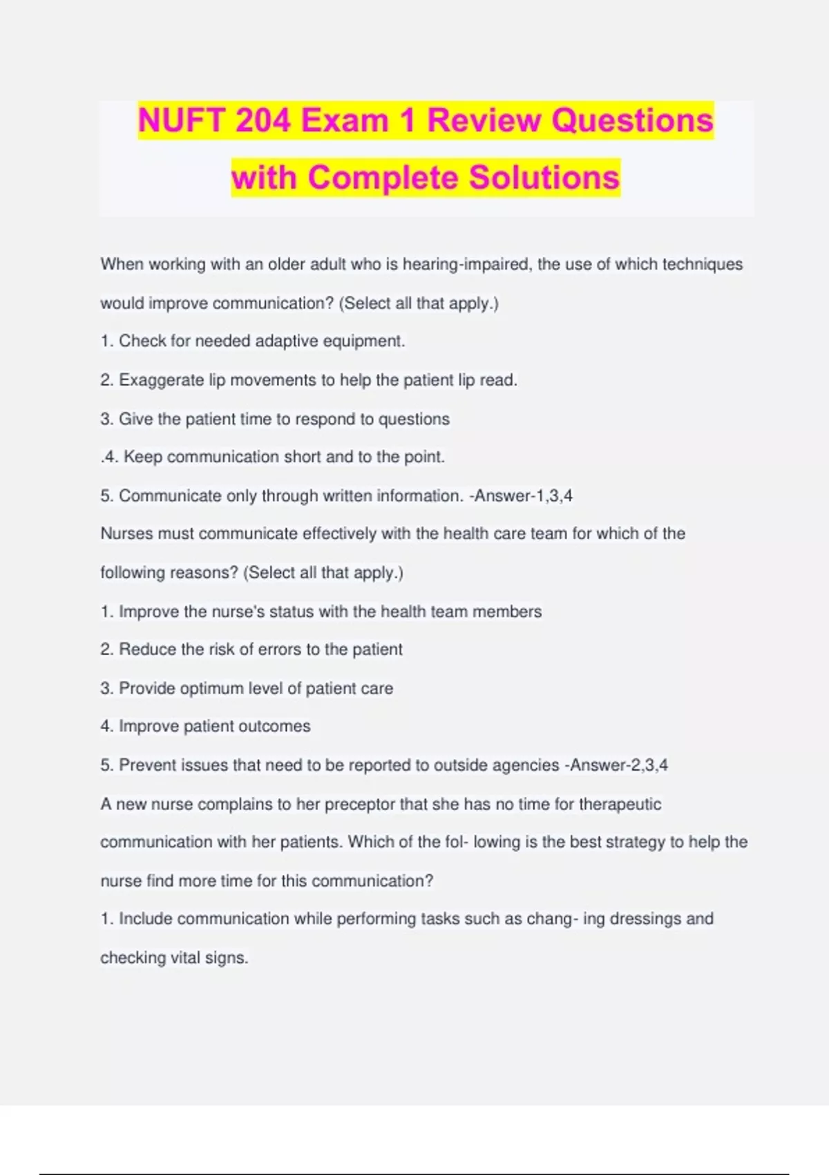 NUFT 204 Exam 1 Review Questions with Complete Solutions When working with an older adult who is hearing-impaired, the use of which techniques would improve communication? (Select all that apply.) 1. Check for needed adaptive equipment. 2. Exaggerate lip movements to help the patient lip read. 3. Give the patient time to respond to questions .4. Keep communication short and to the point. 5. Communicate only through written information. -Answer-1,3,4 Nurses must communicate effectively with the health care team for which of the following reasons? (Select all that apply.) 1. Improve the nurse's status with the health team members 2. Reduce the risk of errors to the patient 3. Provide optimum level of patient care 4. Improve patient outcomes 5. Prevent issues that need to be reported to outside agencies -Answer-2,3,4 A new nurse complains to her preceptor that she has no time for therapeutic communication with her patients. Which of the fol- lowing is the best strategy to help the nurse find more time for this communication? 1. Include communication while performing tasks such as chang- ing dressings and checking vital signs. 2. Ask the patient if you can talk during the last few minutes of visiting hours. 3. Ask Pastoral care to come back a little later in the day. 4. Remind the nurse to complete all her tasks and then set up remaining time for communication. -Answer-1 Motivational interviewing (MI) is a technique that applies under- standing a patient's values and goals in helping the patient make behavior changes. What are other benefits of using MI techniques? (Select all that apply.) 1. Gaining an understanding of patient's motivations 2. Focusing on opportunities to avoid poor health choices 3. Recognizing patient's strengths and supporting their efforts 4. Providing assessment data that can be shared with families to promote change 5. Identifying differences in patient's health goals and current behaviors -Answer-1,3,5 A nurse is talking with a young-adult patient about the purpose of a new medication. The nurse says, "I want to be clear. Can you tell me in your words the purpose of this medicine?" This exchange is an example of which element of the transactional communica- tion process? 1. Message 2. Obtaining feedback 3. Channel 4. Referent -Answer-ans: 2 A patient who is Spanish-speaking does not appear to understand the nurse's information on wound care. Which action should the nurse take? 1. Arrange for a Spanish-speaking social worker to explain the procedure 2. Ask a fellow Spanish-speaking patient to help explain the procedure 3. Use a professional interpreter to provide wound care education in Spanish 4. Ask the patient to write down questions that he or she has for the nurse -Answer-ans: 3 A nurse prepares to contact a patient's physician about a change in the patient's condition. Put the following statements in the correct order using SBAR (Situation, Background, Assessment, and Recommendation) communication. 1. "She is a 53-year-old female who was admitted 2 days ago with pneumonia and was started on Levaquin at 5 PM yester- day. She complains of a poor appetite." 2. "The patient reported feeling very nauseated after her dose of Levaquin an hour ago." 3. "Would you like to make a change in antibiotics, or could we give her a nutritional supplement before her medication?" 4. "The patient started complaining of nausea yesterday evening and has vomited several times during the night." -Answer-Ans: 4S, 1B, 2A, 3R A nurse is assigned to care for a patient for the first time and states, "I don't know a lot about your culture and want to learn how to better meet your health care needs." Which therapeutic commu- nication technique did the nurse use in this situation? 1. Validation 2. Empathy 3. Sarcasm 4. Humility -Answer-Ans: 4 A new nurse is experiencing lateral violence at work. Which steps could the nurse take to address this problem? 1. Challenge the nurses in a public forum to embarrass them and change their behavior 2. Talk with the department secretary and ask if this has been a problem for other nurses 3. Talk with the preceptor or manager and ask for assistance in handling this issue 4. Say nothing and hope things get better -Answer-ans: 3 A nurse has been gathering physical assessment data on a patient and is now listening to the patient's concerns. The nurse sets a goal of care that incorporates the patient's desire to make treatment decisions. This is an example of the nurse engaged in which phase of the nurse-patient relationship? 1. Working phase 2. Preinteraction phase 3. Termination phase 4. Orientation phase -Answer-Ans: 1 A patient is evaluated in the emergency department after causing an automobile accident while being under the influence of alcohol. While assessing the patient, which statement would be the most therapeutic? 1. "Why did you drive after you had been drinking?" 2. "We have multiple patients to see tonight as a result of this accident." 3. "Tell me what happened before, during, and after the automo- bile accident tonight." 4. "It will be okay. No one was seriously hurt in the accident." -Answer-Ans: 3 A nursing student is reviewing a process recording with the instructor. The student engaged the patient in a discussion about availability of family members to provide support at home once the patient is discharged. The student reviews with the instructor whether the comments used encouraged openness and allowed the patient to "tell his story." This is an example of which step of the nursing process? 1. Planning 2. Assessment 3. Intervention 4. Evaluation -Answer-ANS; 4 Which strategies should a nurse use to facilitate a safe transition of care during a patient's transfer from the hospital to a skilled nursing facility? (Select all that apply.) 1. Collaboration between staff members from sending and receiving departments 2. Requiring that the patient visit the facility before a transfer is arranged 3. Using a standardized transfer policy and transfe