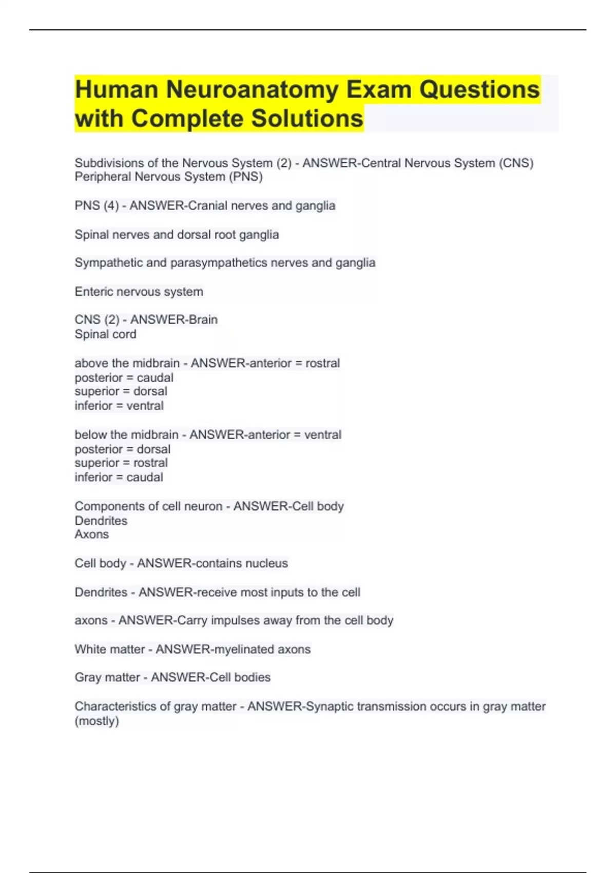Subdivisions of the Nervous System (2) - ANSWER-Central Nervous System (CNS) Peripheral Nervous System (PNS) PNS (4) - ANSWER-Cranial nerves and ganglia Spinal nerves and dorsal root ganglia Sympathetic and parasympathetics nerves and ganglia Enteric nervous system CNS (2) - ANSWER-Brain Spinal cord above the midbrain - ANSWER-anterior = rostral posterior = caudal superior = dorsal inferior = ventral below the midbrain - ANSWER-anterior = ventral posterior = dorsal superior = rostral inferior = caudal Components of cell neuron - ANSWER-Cell body Dendrites Axons Cell body - ANSWER-contains nucleus Dendrites - ANSWER-receive most inputs to the cell axons - ANSWER-Carry impulses away from the cell body White matter - ANSWER-myelinated axons Gray matter - ANSWER-Cell bodies Characteristics of gray matter - ANSWER-Synaptic transmission occurs in gray matter (mostly)
