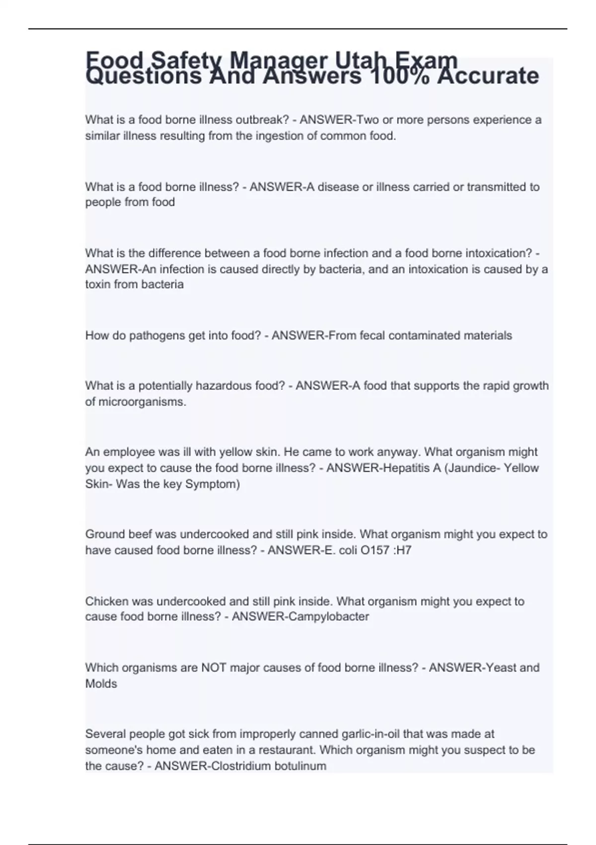 food safety manager utah exam questions stuvia