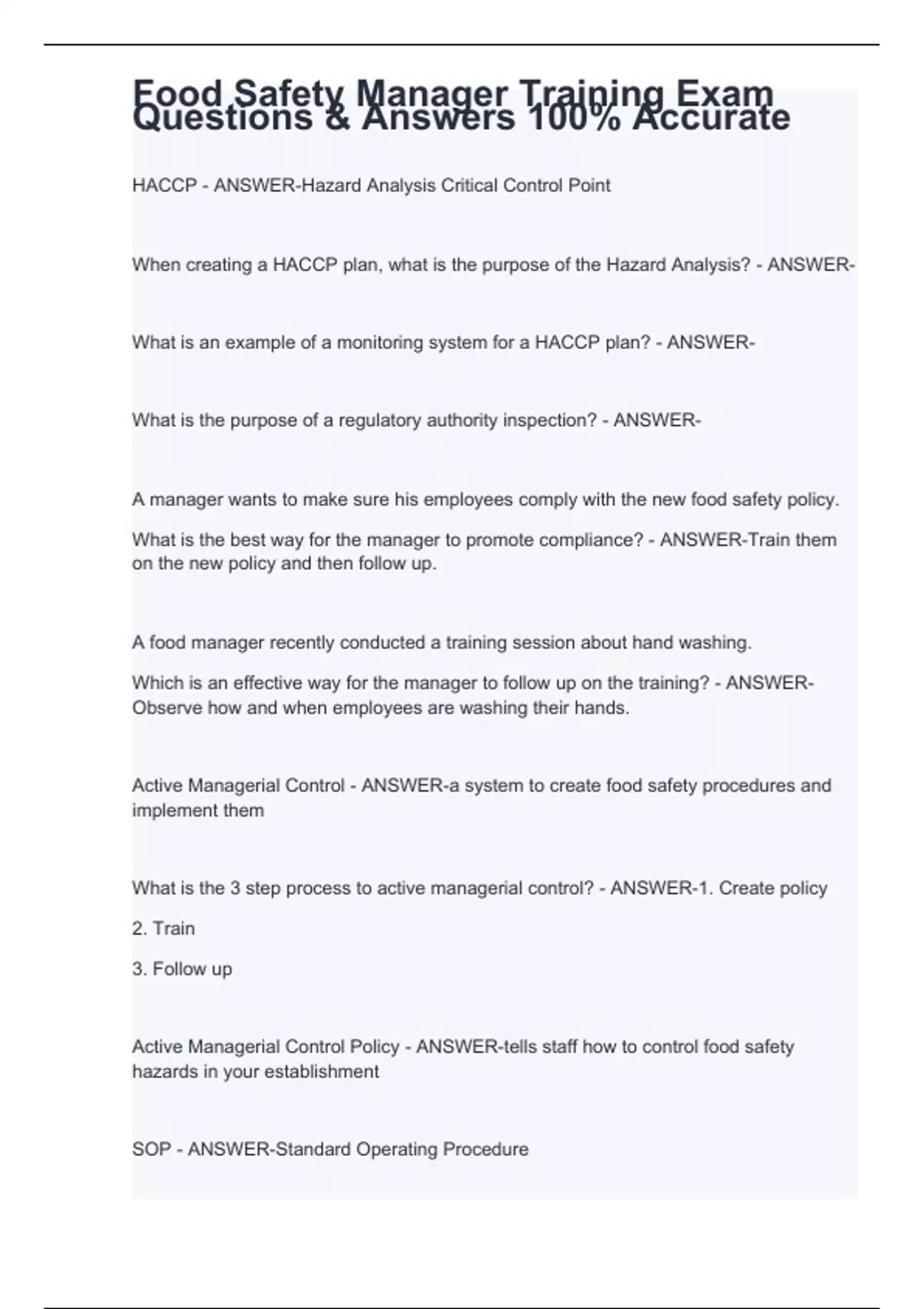 HACCP - ANSWER-Hazard Analysis Critical Control Point When creating a HACCP plan, what is the purpose of the Hazard Analysis? - ANSWER- What is an example of a monitoring system for a HACCP plan? - ANSWER- What is the purpose of a regulatory authority inspection? - ANSWER- A manager wants to make sure his employees comply with the new food safety policy. What is the best way for the manager to promote compliance? - ANSWER-Train them on the new policy and then follow up. A food manager recently conducted a training session about hand washing. Which is an effective way for the manager to follow up on the training? - ANSWER-Observe how and when employees are washing their hands. Active Managerial Control - ANSWER-a system to create food safety procedures and implement them What is the 3 step process to active managerial control? - ANSWER-1. Create policy 2. Train 3. Follow up Active Managerial Control Policy - ANSWER-tells staff how to control food safety hazards in your establishment