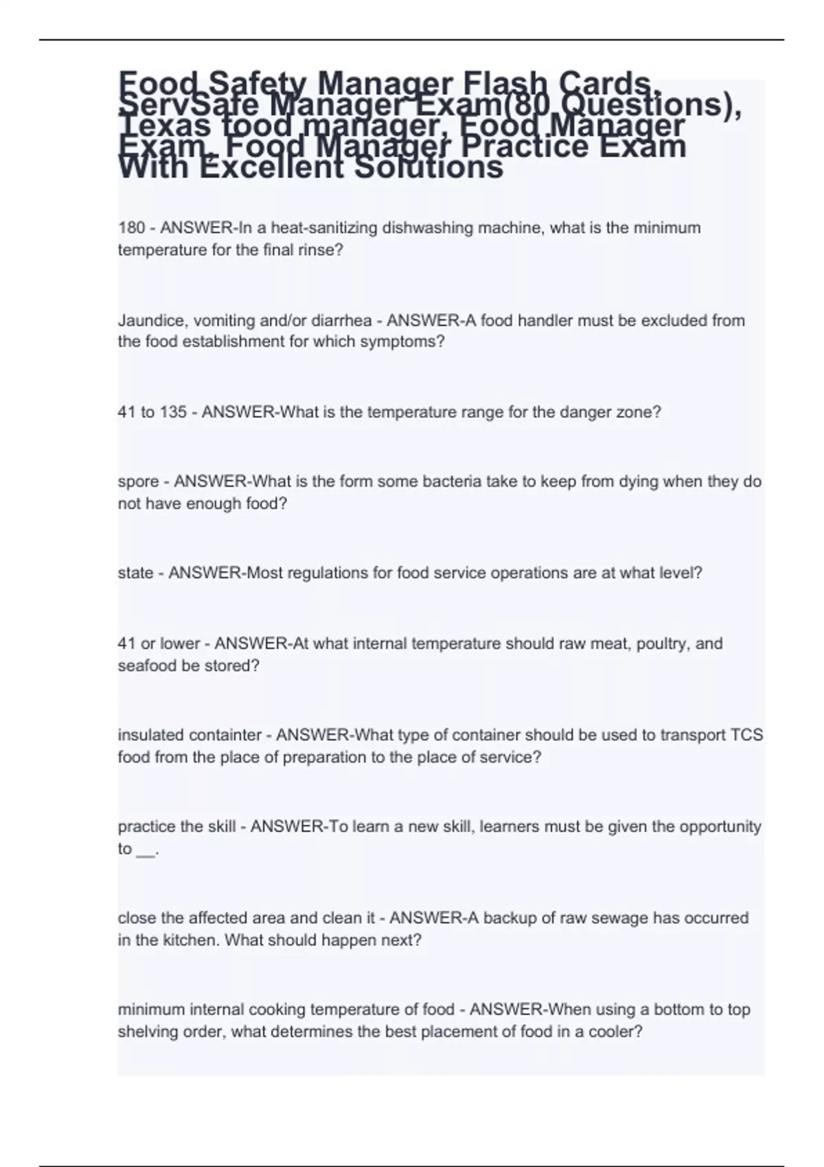 Food Safety Manager Flash Cards, ServSafe Manager Exam(80 Questions), Texas food manager, Food Manager Exam, Food Manager Practice Exam With Excellent Solutions