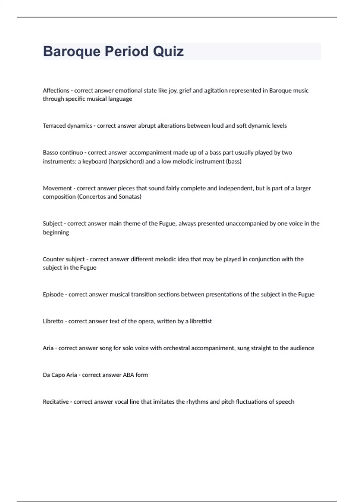 Baroque Period Complete Test With Complete Solutions 2024. Affections - correct answer emotional state like joy, grief and agitation represented in Baroque music through specific musical language Terraced dynamics - correct answer abrupt alterations between loud and soft dynamic levels Basso continuo - correct answer accompaniment made up of a bass part usually played by two instruments: a keyboard (harpsichord) and a low melodic instrument (bass) Movement - correct answer pieces that sound fairly complete and independent, but is part of a larger composition (Concertos and Sonatas) Subject - correct answer main theme of the Fugue, always presented unaccompanied by one voice in the beginning Counter subject - correct answer different melodic idea that may be played in conjunction with the subject in the Fugue Episode - correct answer musical transition sections between presentations of the subject in the Fugue Libretto - correct answer text of the opera, written by a librettist Aria - correct answer song for solo voice with orchestral accompaniment, sung straight to the audience Da Capo Aria - correct answer ABA form Recitative - correct answer vocal line that imitates the rhythms and pitch fluctuations of speech Secco recitative - correct answer accompanied only by a basso continuo Accompanied recitative - correct answer supported by the orchestra Overture - correct answer instrumental composition that opens the opera Florentine Camerata - correct answer group that wanted to return music to the principles of the Ancient Greeks; created monody and developed recitative; turned away from polyphony