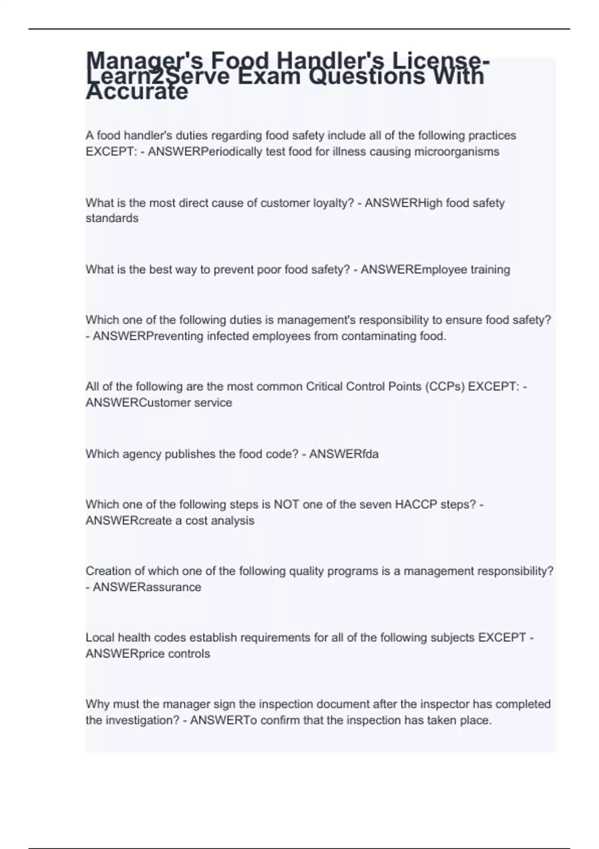 Manager's Food Handler's License- Learn2Serve Exam Questions With Accurate