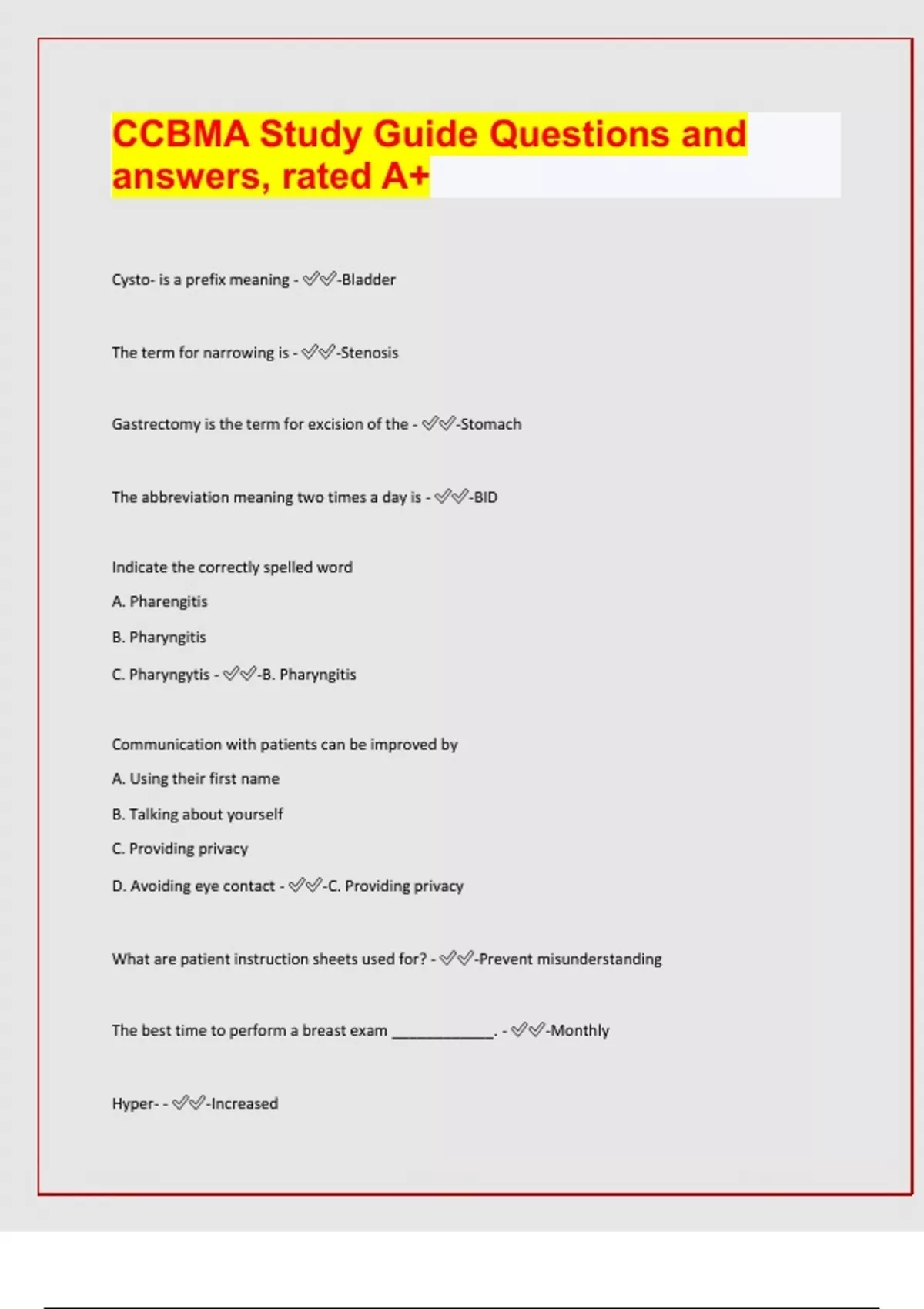 CCBMA Study Guide Questions and answers, rated A+ Cysto- is a prefix meaning - -Bladder The term for narrowing is - -Stenosis Gastrectomy is the term for excision of the - -Stomach The abbreviation meaning two times a day is - -BID Indicate the correctly spelled word A. Pharengitis B. Pharyngitis C. Pharyngytis - -B. Pharyngitis Communication with patients can be improved by A. Using their first name B. Talking about yourself C. Providing privacy D. Avoiding eye contact - -C. Providing privacy What are patient instruction sheets used for? - -Prevent misunderstanding The best time to perform a breast exam ____________. - -Monthly Hyper- - -Increased Nephro- - -Kidney Auto- - -Self Osteo- - -Bone Dys- - -Painful Litho- - -Stone Brady- - -Slow Chole- - -Gallbladder Macro- - -Large Gastro- - -Stomach Arthro- - -Joint Tachy- - -Fast Thoraco- - -Chest Hypo- - -Decreased Mammo- - -Breast Veno- - -Vein Hepato- - -Liver Hemo- - -Blood Opthalmlo- - -Eye Trans- - -Through/across