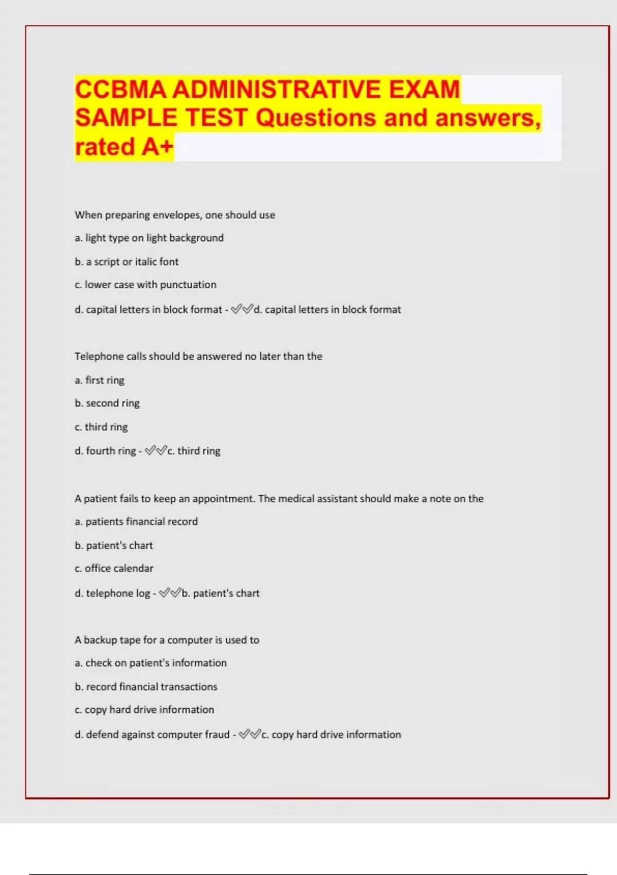 CCBMA ADMINISTRATIVE EXAM SAMPLE TEST Questions and answers, rated A+ When preparing envelopes, one should use a. light type on light background b. a script or italic font c. lower case with punctuation d. capital letters in block format - d. capital letters in block format Telephone calls should be answered no later than the a. first ring b. second ring c. third ring d. fourth ring - c. third ring A patient fails to keep an appointment. The medical assistant should make a note on the a. patients financial record b. patient's chart c. office calendar d. telephone log - b. patient's chart A backup tape for a computer is used to a. check on patient's information b. record financial transactions c. copy hard drive information d. defend against computer fraud - c. copy hard drive information Which name would be filed first in an alphabetical filing system? a. George Jones b. James Meacham c. Wilson Babcock d. John Williams' - c. Wilson Babcock CPT codes are used to identify a/an a. on the job injury b. chronic disease c. medical procedure d. deep laceration - c. medical procedure ICD-9 codes are used to identify a/an a. surgical procedure b. medical diagnosis c. wound repair d. obstetrical delivery - b. medical diagnosis Patient insurance cards should be reviewed a. at each visit b. every quarter c. twice each year d. once a year - a. at each visit an HMO is an example of_____ healthcare.