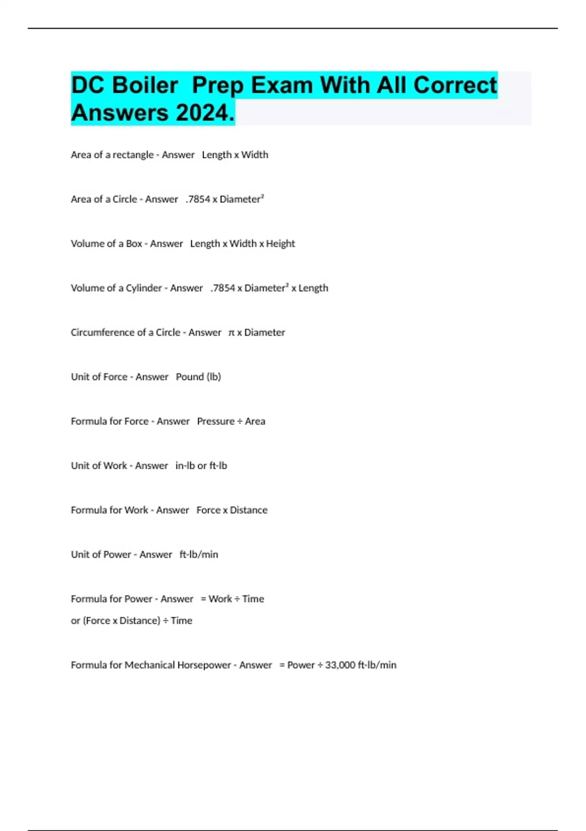 Area of a rectangle - Answer Length x Width Area of a Circle - Answer .7854 x Diameter² Volume of a Box - Answer Length x Width x Height Volume of a Cylinder - Answer .7854 x Diameter² x Length Circumference of a Circle - Answer π x Diameter Unit of Force - Answer Pound (lb) Formula for Force - Answer Pressure ÷ Area Unit of Work - Answer in-lb or ft-lb Formula for Work - Answer Force x Distance Unit of Power - Answer ft-lb/min Formula for Power - Answer = Work ÷ Time or (Force x Distance) ÷ Time Formula for Mechanical Horsepower - Answer = Power ÷ 33,000 ft-lb/min