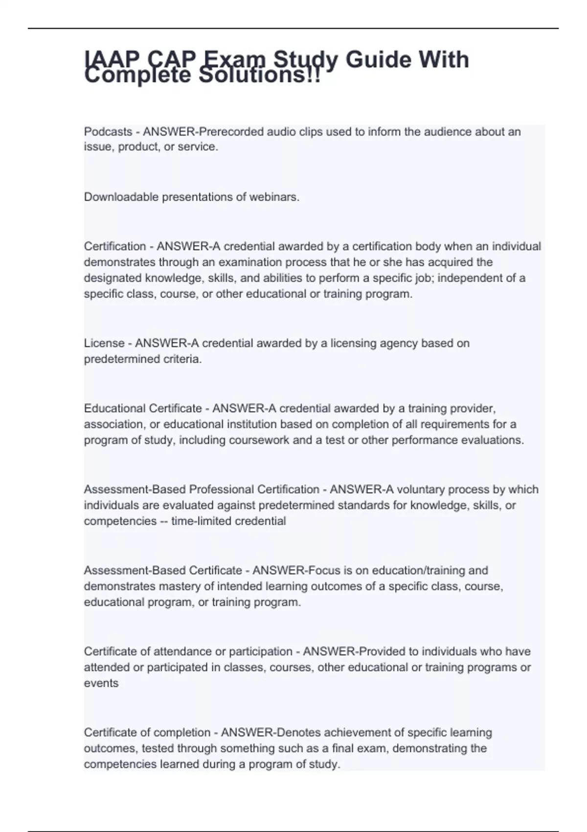 Downloadable presentations of webinars. Certification - ANSWER-A credential awarded by a certification body when an individual demonstrates through an examination process that he or she has acquired the designated knowledge, skills, and abilities to perform a specific job; independent of a specific class, course, or other educational or training program. License - ANSWER-A credential awarded by a licensing agency based on predetermined criteria. Educational Certificate - ANSWER-A credential awarded by a training provider, association, or educational institution based on completion of all requirements for a program of study, including coursework and a test or other performance evaluations. Assessment-Based Professional Certification - ANSWER-A voluntary process by which individuals are evaluated against predetermined standards for knowledge, skills, or competencies -- time-limited credential Assessment-Based Certificate - ANSWER-Focus is on education/training and demonstrates mastery of intended learning outcomes of a specific class, course, educational program, or training program. Certificate of attendance or participation - ANSWER-Provided to individuals who have attended or participated in classes, courses, other educational or training programs or events