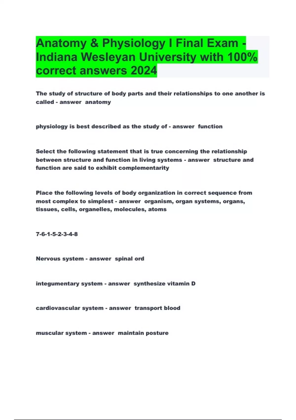 Anatomy & Physiology I Final Exam - Indiana Wesleyan University with 100% correct answers 2024