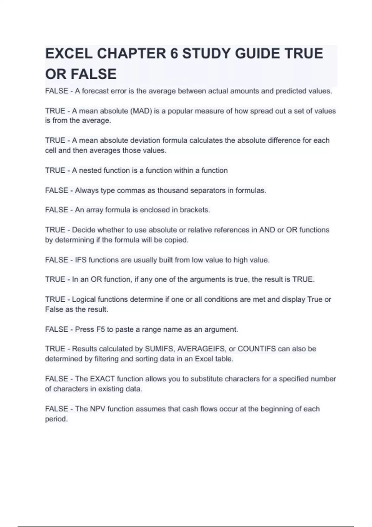 EXCEL CHAPTER 6 STUDY GUIDE TRUE OR FALSE with complete solution