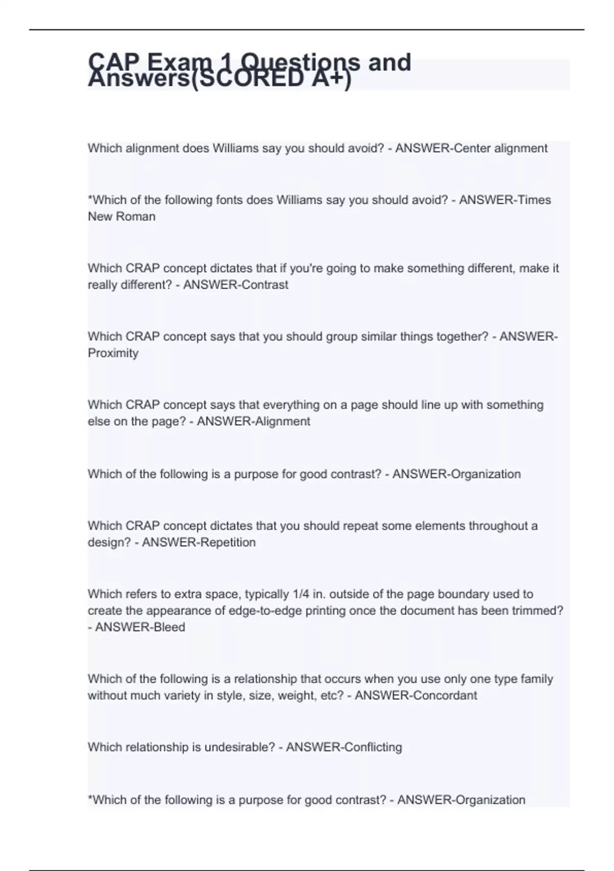 *Which of the following fonts does Williams say you should avoid? - ANSWER-Times New Roman Which CRAP concept dictates that if you're going to make something different, make it really different? - ANSWER-Contrast Which CRAP concept says that you should group similar things together? - ANSWER-Proximity Which CRAP concept says that everything on a page should line up with something else on the page? - ANSWER-Alignment Which of the following is a purpose for good contrast? - ANSWER-Organization Which CRAP concept dictates that you should repeat some elements throughout a design? - ANSWER-Repetition Which refers to extra space, typically 1/4 in. outside of the page boundary used to create the appearance of edge-to-edge printing once the document has been trimmed? - ANSWER-Bleed Which of the following is a relationship that occurs when you use only one type family without much variety in style, size, weight, etc? - ANSWER-Concordant Which relationship is undesirable? - ANSWER-Conflicting