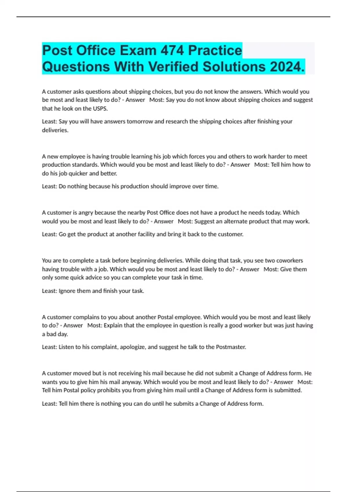 Post Office Exam 474 Practice Questions With Verified Solutions 2024.