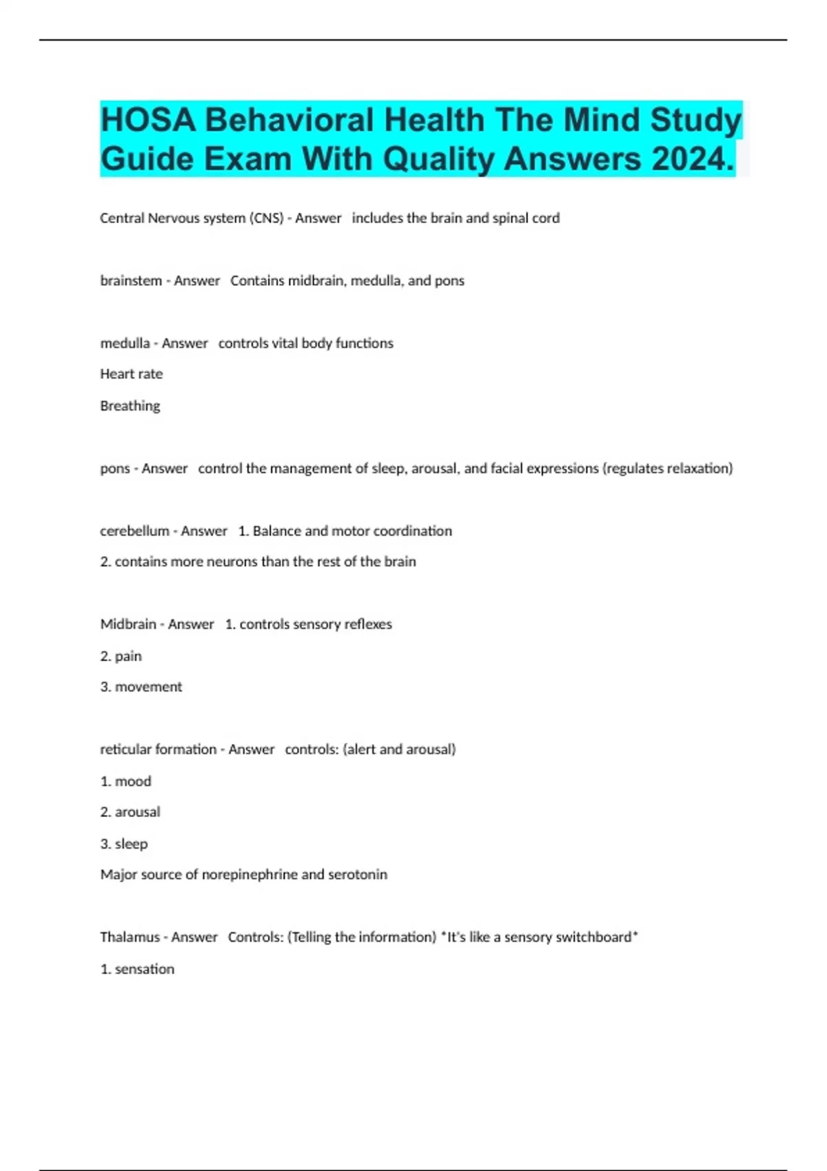 HOSA Behavioral Health The Mind Study Guide Exam With Quality Answers 2024.