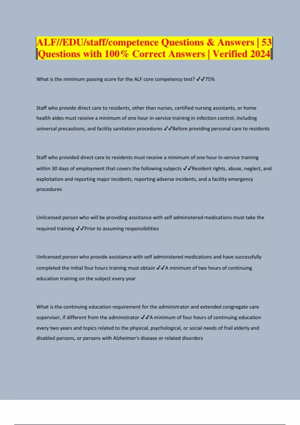 What is the minimum passing score for the ALF core competency test? 75% Staff who provide direct care to residents, other than nurses, certified nursing assistants, or home health aides must receive a minimum of one hour in-service training in infection control, including universal precautions, and facility sanitation procedures Before providing personal care to residents Staff who provided direct care to residents must receive a minimum of one hour in-service training within 30 days of employment that covers the following subjects Resident rights, abuse, neglect, and exploitation and reporting major incidents, reporting adverse incidents, and a facility emergency procedures Unlicensed person who will be providing assistance with self administered medications must take the required training Prior to assuming responsibilities