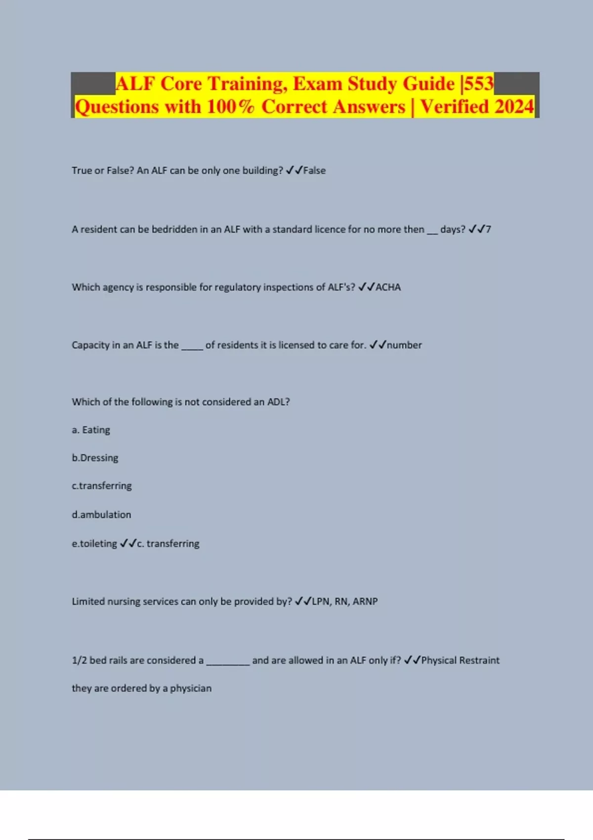 ALF Core Training, Exam Study Guide |553 Questions with 100% Correct Answers | Verified 2024