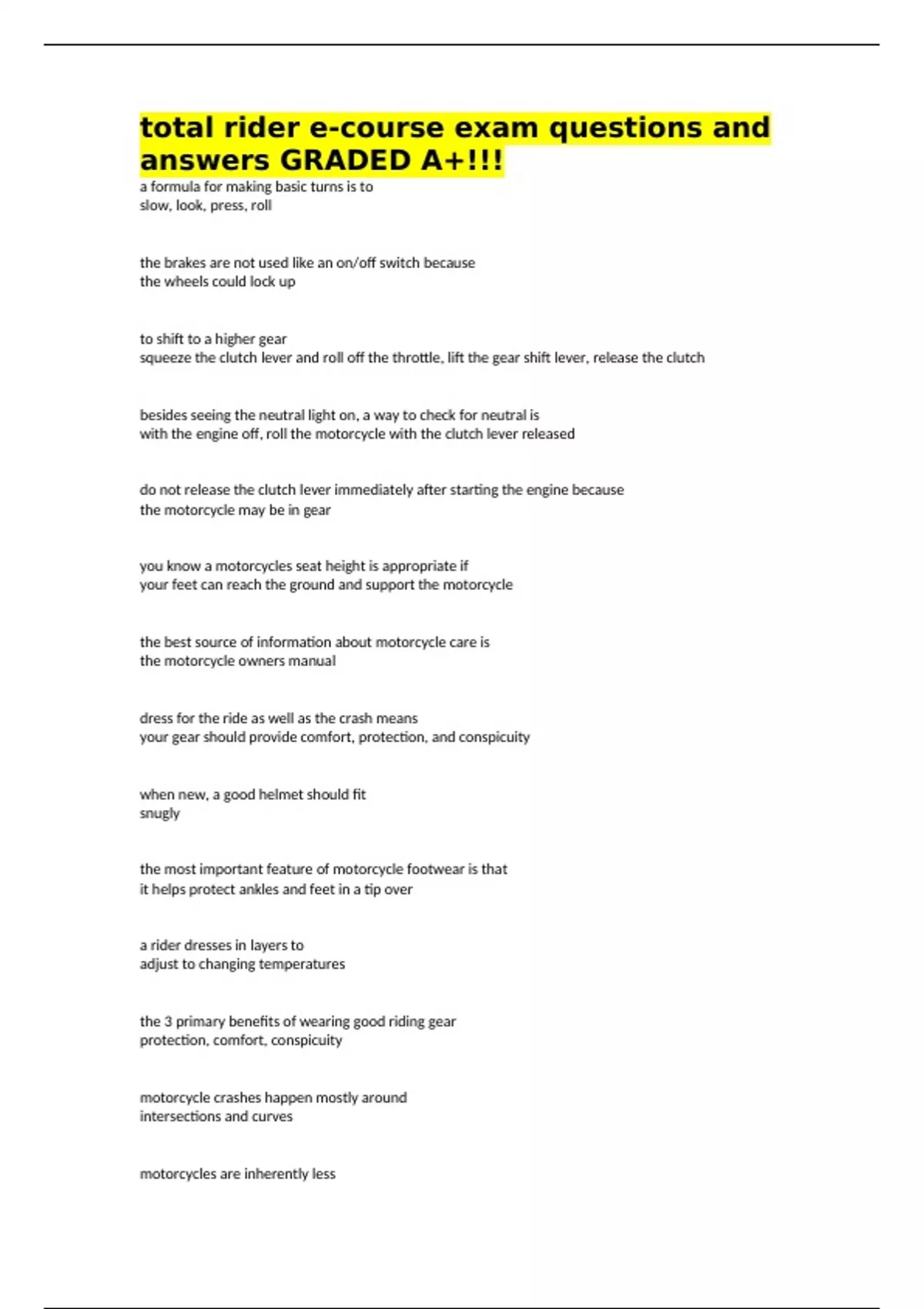 total rider e-course exam questions and answers GRADED A+!!!