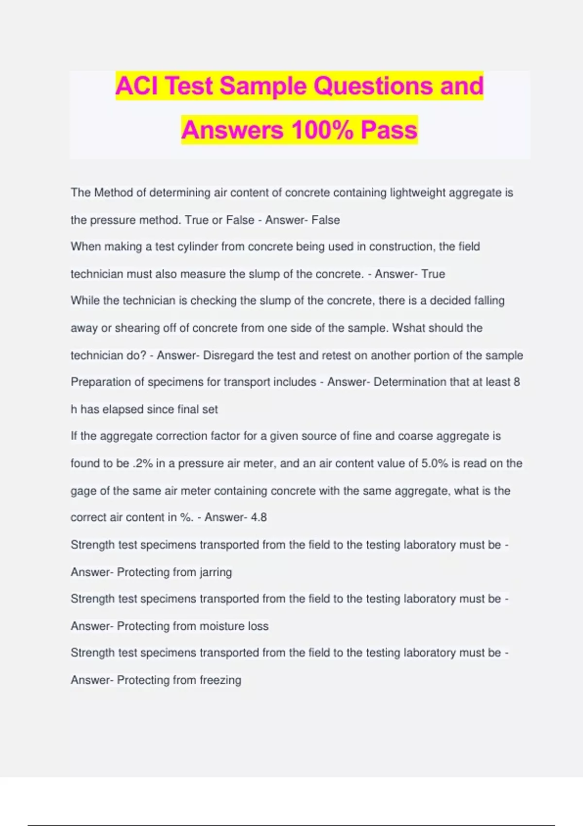 ACI Test Sample Questions and Answers 100% Pass The Method of determining air content of concrete containing lightweight aggregate is the pressure method. True or False - Answer- False When making a test cylinder from concrete being used in construction, the field technician must also measure the slump of the concrete. - Answer- True While the technician is checking the slump of the concrete, there is a decided falling away or shearing off of concrete from one side of the sample. Wshat should the technician do? - Answer- Disregard the test and retest on another portion of the sample Preparation of specimens for transport includes - Answer- Determination that at least 8 h has elapsed since final set If the aggregate correction factor for a given source of fine and coarse aggregate is found to be .2% in a pressure air meter, and an air content value of 5.0% is read on the gage of the same air meter containing concrete with the same aggregate, what is the correct air content in %. - Answer- 4.8 Strength test specimens transported from the field to the testing laboratory must be - Answer- Protecting from jarring Strength test specimens transported from the field to the testing laboratory must be - Answer- Protecting from moisture loss Strength test specimens transported from the field to the testing laboratory must be - Answer- Protecting from freezing