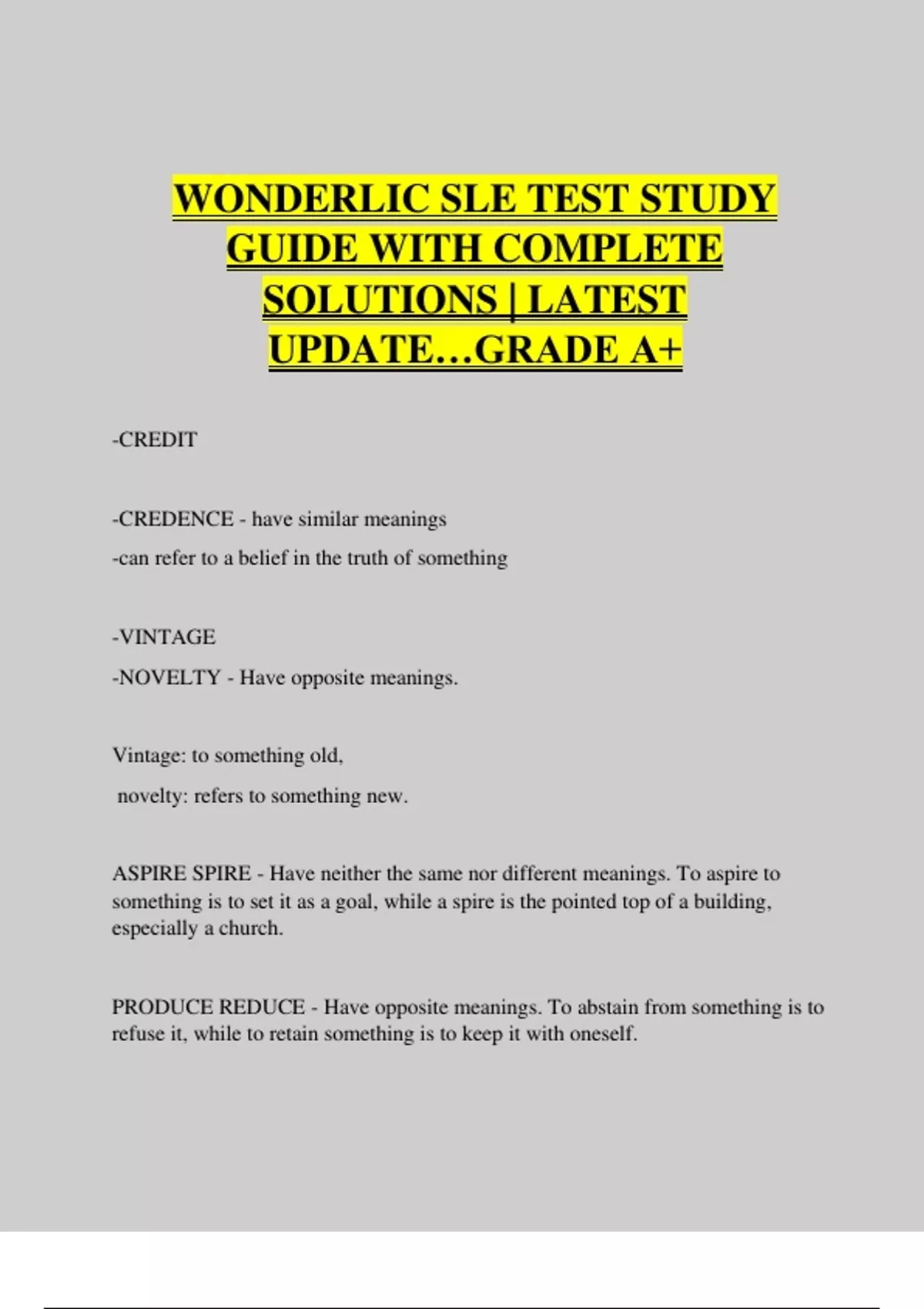 WONDERLIC SLE TEST STUDY GUIDE WITH COMPLETE SOLUTIONS | LATEST UPDATE…GRADE A+ -CREDIT -CREDENCE - have similar meanings -can refer to a belief in the truth of something -VINTAGE -NOVELTY - Have opposite meanings. Vintage: to something old, novelty: refers to something new. ASPIRE SPIRE - Have neither the same nor different meanings. To aspire to something is to set it as a goal, while a spire is the pointed top of a building, especially a church. PRODUCE REDUCE - Have opposite meanings. To abstain from something is to refuse it, while to retain something is to keep it with oneself.