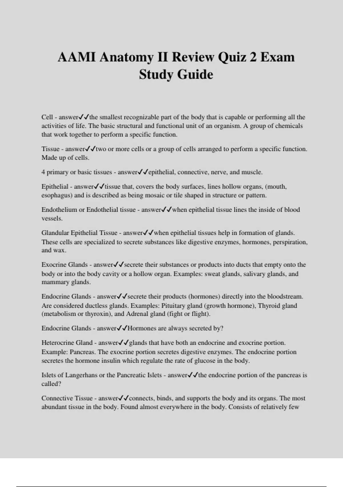 AAMI Anatomy II Review Quiz 2 Exam Study Guide Cell - answerthe smallest recognizable part of the body that is capable or performing all the activities of life. The basic structural and functional unit of an organism. A group of chemicals that work together to perform a specific function. Tissue - answertwo or more cells or a group of cells arranged to perform a specific function. Made up of cells. 4 primary or basic tissues - answerepithelial, connective, nerve, and muscle. Epithelial - answertissue that, covers the body surfaces, lines hollow organs, (mouth, esophagus) and is described as being mosaic or tile shaped in structure or pattern. Endothelium or Endothelial tissue - answerwhen epithelial tissue lines the inside of blood vessels. Glandular Epithelial Tissue - answerwhen epithelial tissues help in formation of glands. These cells are specialized to secrete substances like digestive enzymes, hormones, perspiration, and wax. Exocrine Glands - answersecrete their substances or products into ducts that empty onto the body or into the body cavity or a hollow organ. Examples: sweat glands, salivary glands, and mammary glands. Endocrine Glands - answersecrete their products (hormones) directly into the bloodstream. Are considered ductless glands. Examples: Pituitary gland (growth hormone), Thyroid gland (metabolism or thyroxin), and Adrenal gland (fight or flight). Endocrine Glands - answerHormones are always secreted by? Heterocrine Gland - answerglands that have both an endocrine and exocrine portion. Example: Pancreas. The exocrine portion secretes digestive enzymes. The endocrine portion secretes the hormone insulin which regulate the rate of glucose in the body. Islets of Langerhans or the Pancreatic Islets - answerthe endocrine portion of the pancreas is called? Connective Tissue - answerconnects, binds, and supports the body and its organs. The most abundant tissue in the body. Found almost everywhere in the body. Consists of relatively few
