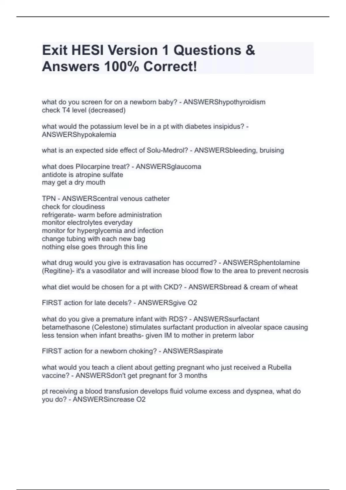 what do you screen for on a newborn baby? - ANSWERShypothyroidism check T4 level (decreased) what would the potassium level be in a pt with diabetes insipidus? - ANSWERShypokalemia what is an expected side effect of Solu-Medrol? - ANSWERSbleeding, bruising what does Pilocarpine treat? - ANSWERSglaucoma antidote is atropine sulfate may get a dry mouth TPN - ANSWERScentral venous catheter check for cloudiness refrigerate- warm before administration monitor electrolytes everyday monitor for hyperglycemia and infection change tubing with each new bag nothing else goes through this line what drug would you give is extravasation has occurred? - ANSWERSphentolamine (Regitine)- it's a vasodilator and will increase blood flow to the area to prevent necrosis what diet would be chosen for a pt with CKD? - ANSWERSbread & cream of wheat FIRST action for late decels? - ANSWERSgive O2 what do you give a premature infant with RDS? - ANSWERSsurfactant betamethasone (Celestone) stimulates surfactant production in alveolar space causing less tension when infant breaths- given IM to mother in preterm labor FIRST action for a newborn choking? - ANSWERSaspirate what would you teach a client about getting pregnant who just received a Rubella vaccine? - ANSWERSdon't get pregnant for 3 months pt receiving a blood transfusion develops fluid volume excess and dyspnea, what do you do? - ANSWERSincrease O2