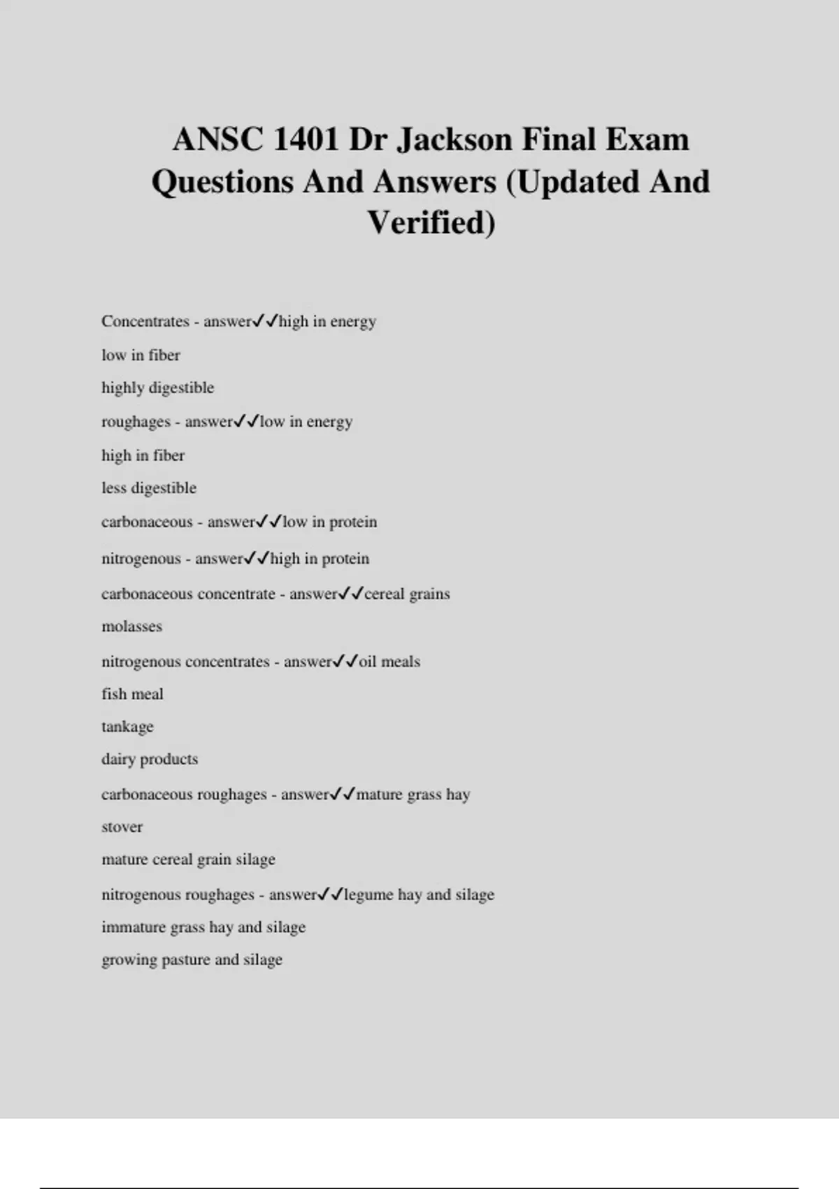 ANSC 1401 Dr Jackson Final Exam Questions And Answers (Updated And Verified) Concentrates - answerhigh in energy low in fiber highly digestible roughages - answerlow in energy high in fiber less digestible carbonaceous - answerlow in protein nitrogenous - answerhigh in protein carbonaceous concentrate - answercereal grains molasses nitrogenous concentrates - answeroil meals fish meal tankage dairy products carbonaceous roughages - answermature grass hay stover mature cereal grain silage nitrogenous roughages - answerlegume hay and silage immature grass hay and silage growing pasture and silage nutrients - answerchemical substances in either mineral or compound form that are absorbed from the digestive tract into the blood and that function in metabolism of the body water - answercheapest and most abundant nutrient water sources - answerdrinking ingested metabolic water function - answertransport of nutrients and excretions chemical reactions and solvent properties body temperature regulation maintenance of shape of body cells lubrication and cushioning of joints and organs proteins - answercomposed of 22 amino acids protein structure - answeramino acids-peptide-polypeptide-protein essential amino acids - answermust be supplied in diet because body cannot synthesize them fast enough MATT HILL VP methionine, arginine, threonine, tryptophan, histidine, isoleucine, leucine, lysine, valine, phenylalanine nonessential amino acids - answeressential to the animal but they can be synthesized by the body to meet the needs protein function - answerbasic structural unit of animal body body metabolism energy source photosynthesis - answerproduces CHOs 6CO2+6H2O+637 calories from sunlight--chlorophyll-- C6H12O6+6O2 monosaccharides - answerC6H12O6 one sugar molecule glucose