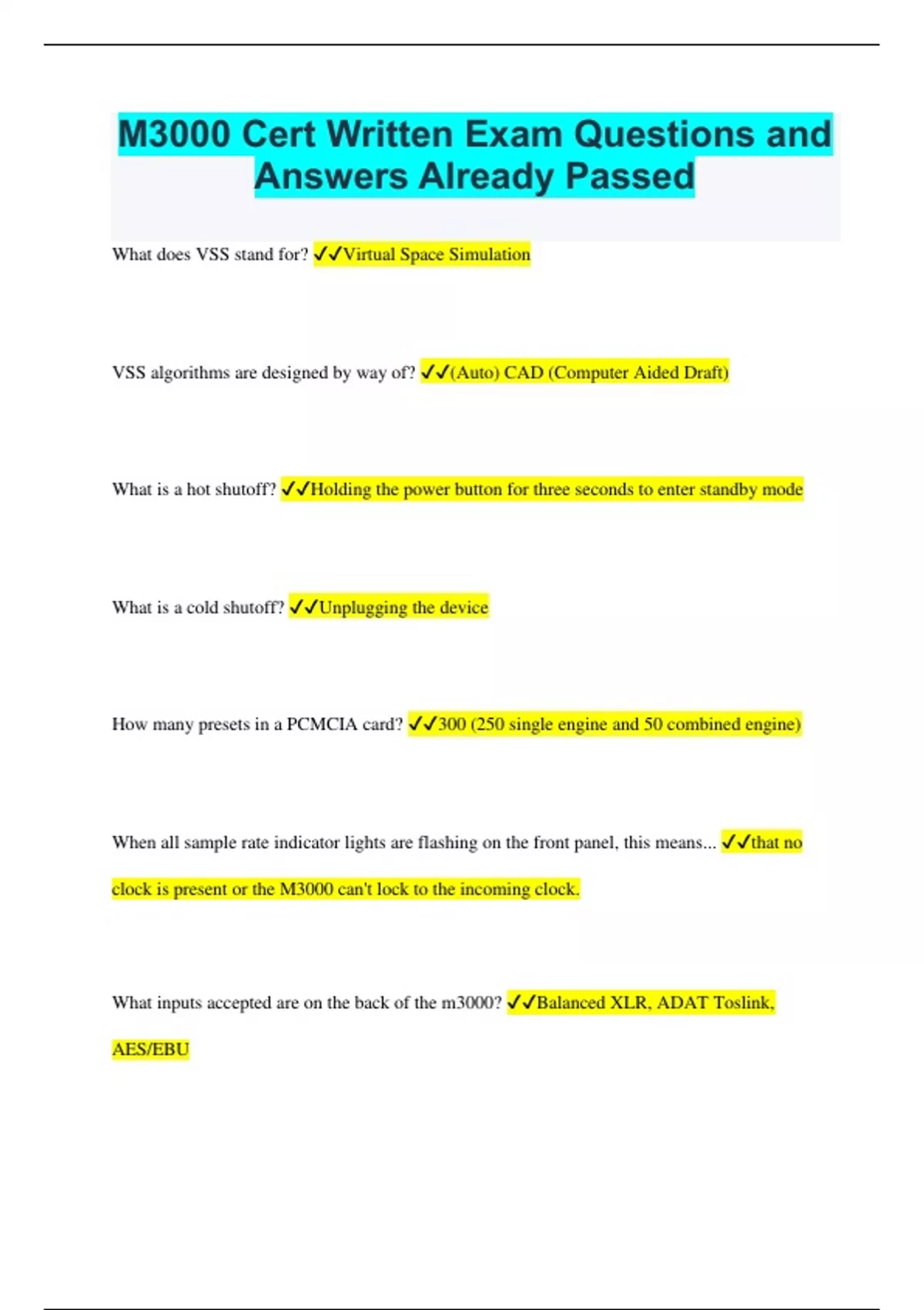 M3000 Cert Written Exam Questions and Answers Already Passed What does VSS stand for? Virtual Space Simulation VSS algorithms are designed by way of? (Auto) CAD (Computer Aided Draft) What is a hot shutoff? Holding the power button for three seconds to enter standby mode What is a cold shutoff? Unplugging the device How many presets in a PCMCIA card? 300 (250 single engine and 50 combined engine) When all sample rate indicator lights are flashing on the front panel, this means... that no clock is present or the M3000 can't lock to the incoming clock. What inputs accepted are on the back of the m3000? Balanced XLR, ADAT Toslink, AES/EBU Which setup column is Mix under? I/O Which setup column is clock/sample rate under? I/O Which two sample rates can be used on the m3000? 44.1 kHz and 48 kHz What is the Serial routing option? This is a stereo input/output mode where the output of Engine 1 feeds the input of Engine 2. Helpful for going out a dynamics processor and into a TBP What is the Parallel routing option? Both Engines will work independently and the outputs will be mixed down to the left and right. Useful when feeding the engine one source. Can you use Parallel with a stereo source? No What is the Linked routing option? The two Engines are linked together. Anything done on one Engine will be done to the other (aka Stereo) What is the Preset Glide routing option? A one time cross fade between presets. This allows for very smooth transitions when switched from one effect to another. Where do you set the preset glide time? Under UTIL/MIDI What setup column is Glide Timer under? UTIL/MIDI What setup column is MIDI Input and Output under? UTIL/MIDI What setup column is Security under? UTIL/MIDI How do you use an external device with the m3000?