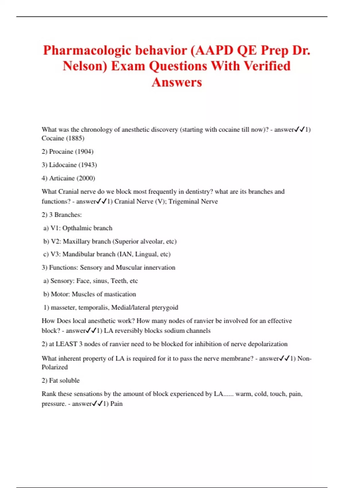 Pharmacologic behavior (AAPD QE Prep Dr. Nelson) Exam Questions With Verified Answers What was the chronology of anesthetic discovery (starting with cocaine till now)? - answer1) Cocaine (1885) 2) Procaine (1904) 3) Lidocaine (1943) 4) Articaine (2000) What Cranial nerve do we block most frequently in dentistry? what are its branches and functions? - answer1) Cranial Nerve (V); Trigeminal Nerve 2) 3 Branches: a) V1: Opthalmic branch b) V2: Maxillary branch (Superior alveolar, etc) c) V3: Mandibular branch (IAN, Lingual, etc) 3) Functions: Sensory and Muscular innervation a) Sensory: Face, sinus, Teeth, etc b) Motor: Muscles of mastication 1) masseter, temporalis, Medial/lateral pterygoid How Does local anesthetic work? How many nodes of ranvier be involved for an effective block? - answer1) LA reversibly blocks sodium channels 2) at LEAST 3 nodes of ranvier need to be blocked for inhibition of nerve depolarization What inherent property of LA is required for it to pass the nerve membrane? - answer1) Non- Polarized 2) Fat soluble Rank these sensations by the amount of block experienced by LA...... warm, cold, touch, pain, pressure. - answer1) Pain 2) Cold 3) Warmth 4) Touch 5) Deep pressure Name the three parts of a Local anesthetic (structure/composition-wise) and there roles. - answer1) Lipophilic (to penetrate anatomic barrier) 2) Intermediate chain (amide or ester, distinguishes area of metabolism) 3) Hydrophilic (ensures that drug will not precipitate in interstitial fluid/space) T or F: Local anesthetics are weak acids with a pKa of 7.5-9.5) - answerFALSE, LA are weak BASES with a pKa of 7.5-9.5) what determines the Non-Ionized (basic) % of anesthetic? - answer1) Tissue pH determines % of un-ionized LA 2) Dissociation Constant (pKa) determines % non-ionized LA T or F: Tissue acts as a buffer to convert cationic LA to its non-ionized base form - answerTRUE; Tissues have bicarbonate that raises the pH and makes LA more readily available in its unionized form what is the pKa of most LA's ? - answer1) the pKa of most LA's is between 7.5-9.5 T or F: Higher pKa means more non-ionized molecules and more effective diffusion - answerFalse; LOW pKa leads to more non-ionized particle and therefore more effective diffusion what is physiologic pH and why? how does this effect LA? - answer1) Physiologic pH is 7.4 2) Bicarbonate is a natural buffer 3) physiologic buffering makes LA MORE effective because it leaves more non-ionized form available What is the pH of a dental cartridge of lidocaine? How much is in non-ionized form at this pH? How then LA effective in these conditions? - answer1) pH 6 (of a lidocaine cartridge) 2) 1% of lidocaine is Non-ionized at this pH 3) Physiologic pH (bicarbonate) will make more non-ionized form readily available at physiologic pH, how much (in %) of non-ionized LA is available? - answer1) physiologic pH 7.4 2) 24% is non-ionized at this pH (due to bicarbonate in tissue) What environmental factors alter the effectiveness of LA and why? - answer1) Rapid Extrusion of LA....it increases volume of LA compared to available bicarbonate (slow extrusion is better!) 2) Infection, significantly lowers pH and therefore the ability to buffer LA, making less non- ionized form available what are the pKa's of Mepivicaine, Articaine, Lidocaine, Bupivicaine? - answer1) Mepivicaine 7.7 2) lidocaine 7.8 3) Articaine 7.8 4) bupivicaine 8.1 Which injection technique is most prone to hematoma formation? - answer1) PSA (infiltration is effective and does not pose the same risk) which anesthetic technique is more of a "pressure" anesthesia? - answer1) intra-pulpal injection What is the gauge of a yellow capped needle? a blue capped needle? which one has the largest diameter? - answer1) Yellow-27 Gauge 2) blue-30 gauge 3) yellow (27 gauge) has a larger diameter What are causes of "injection pain"? (list three) - answer1) Mechanical trauma (needle penetration) 2) Distention of tissue from LA 3) Anesthetic properties (Temperature, pH, etc) T or F: larger gauge needles are more painful? - answerFalse, in studies conducted, no discernible differences were found (LARGER gauge needles are recommended) How/Why is a larger gauge needles recommended for LA delivery? - answer1) Larger gauge needles are: a) Less likely to break b) easier to aspirate c) less likely to deflect (less fragile) what determines level/efficacy of anesthesia? - answer1) LA PROXIMITY to nerve 2) Degree of ionization